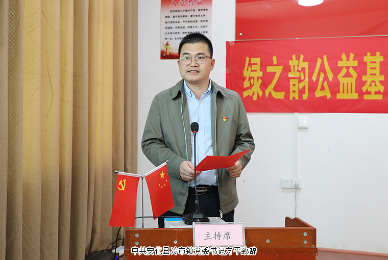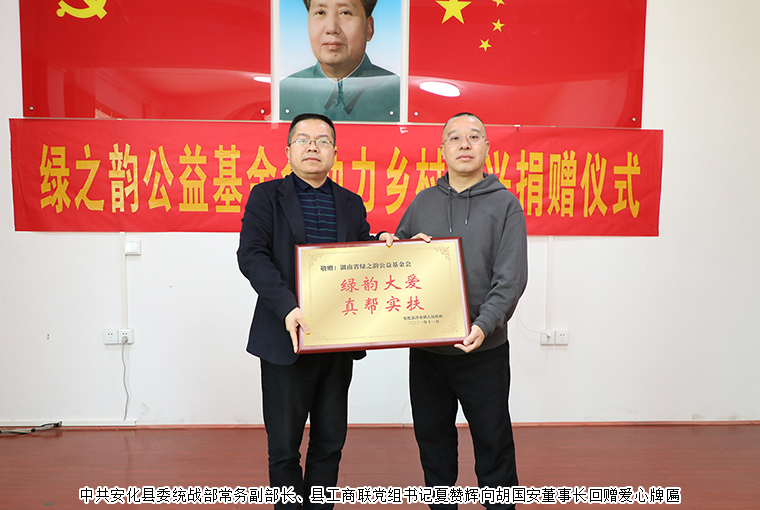 捐贈儀式由安化縣人民政府黨組成員、副縣長陽鋒主持?;顒右潦迹泄舶不h冷市鎮(zhèn)黨委書記方平致辭。他首先向致公黨湖南省委會互聯網+專委會,綠之韻集團等愛心企業(yè)的到來表示熱烈地歡迎。向長期以來關心、支持和幫助安化實施鄉(xiāng)村振興戰(zhàn)略的致公黨湖南省委會及社會各界人士表示衷心感謝。隨后,湖南省政協委員、致公黨湖南省委會互聯網+專委會名譽主任、綠之韻集團董事長胡國安代表綠之韻公益基金會向胡家村村委捐贈108萬元愛心支票,安化縣委統戰(zhàn)部常務副部長、縣工商聯黨組書記夏贊輝,胡家村村支部書記胡利民分別向綠之韻集團、致公黨互聯網+專委會回贈愛心牌匾。