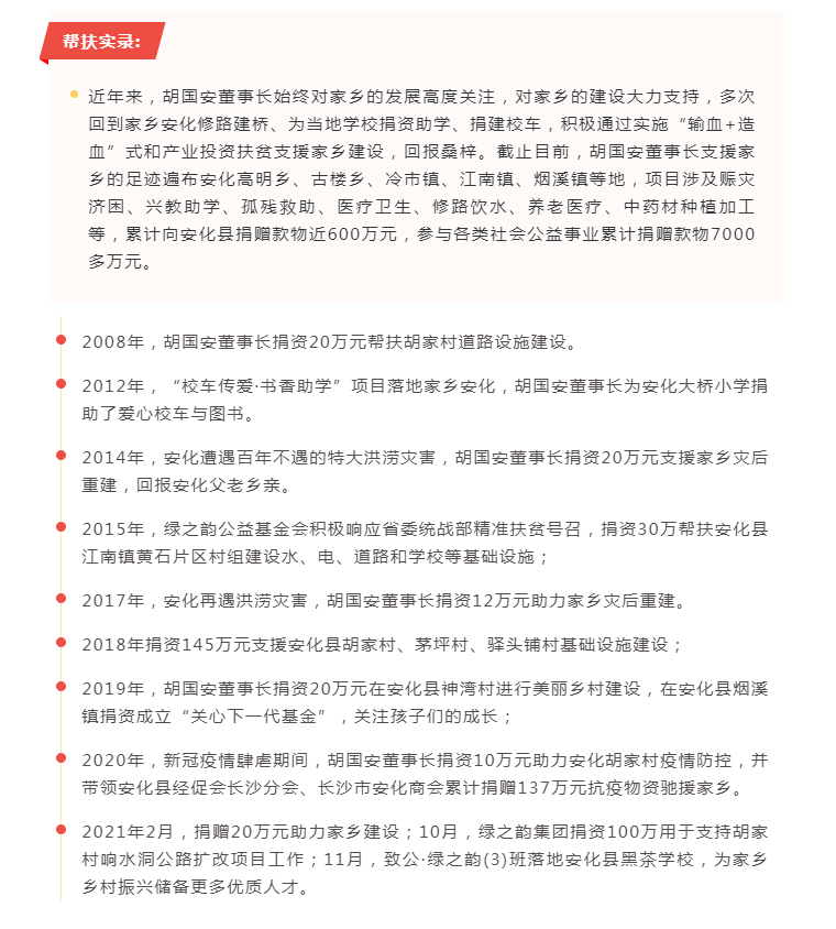在與致公黨湖南省委會互聯網+專委會深入安化胡家村開展鄉(xiāng)村振興專項調研的過程中,胡國安董事長表示,胡家村要實現從脫貧攻堅到鄉(xiāng)村振興的轉換,必須因地制宜,因地制策,做好相關規(guī)劃,其中,產業(yè)振興是胡家村鄉(xiāng)村振興最基礎的要求,也是最基本的保障。只有從根本上構建起可持續(xù)的產業(yè)發(fā)展長效機制,才能夠持續(xù)鞏固脫貧攻堅發(fā)展成果,切實加強防止返貧。未來,綠之韻公益基金會將攜手更多愛心企業(yè),社會組織等積極參與到胡家村鄉(xiāng)村振興的具體規(guī)劃中,助力家鄉(xiāng)建設。一是美麗村組建設,即村容村貌建設以及對疫情災情幫扶和困難家庭幫扶;二是特色產業(yè)幫扶,繼續(xù)加大以茶產業(yè)和黃精種植為主體的中藥材產業(yè),增強人才、技術和資金投入,強化企業(yè)化市場運作體系,讓村民真正得到實惠。今后,他將繼續(xù)引領企業(yè),履行社會責任,高度關注和支持家鄉(xiāng)安化建設和發(fā)展,用實實在在的行動帶動更多的愛心人士和企業(yè)參與到“鄉(xiāng)村振興”和“助力共同富?!敝衼?,使家鄉(xiāng)人民得實惠、普受惠、常受惠,為現代化新安化貢獻力量。