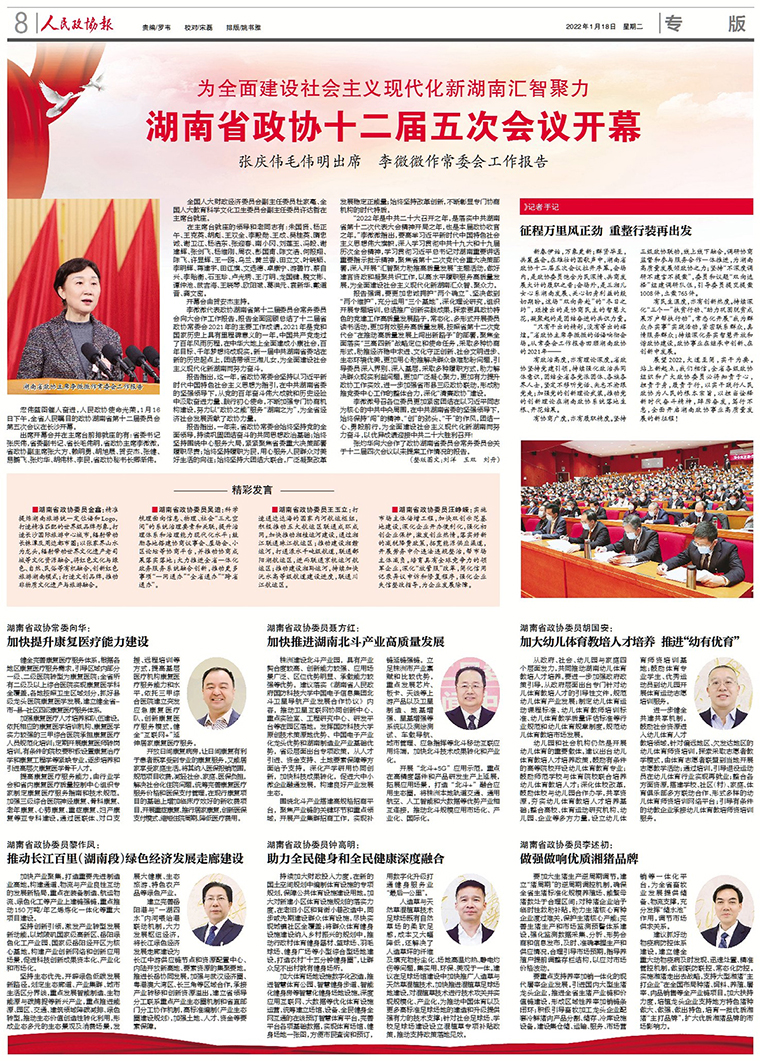 16日下午2時30分,賀安杰宣布大會開幕,全體起立,奏唱國歌。報告全面回顧總結了十二屆省政協(xié)常委會2021年的主要工作成績。2021年是黨和國家歷史上具有里程碑意義的一年。中國共產黨走過了百年風雨歷程,在中華大地上全面建成小康社會,百年目標、千年夢想終成現(xiàn)實。新一屆中共湖南省委站在新的歷史起點上,團結帶領三湘兒女,意氣風發(fā)行進在全面建設社會主義現(xiàn)代化的新征程上。這一年,省政協(xié)常委會堅持以習近平新時代中國特色社會主義思想為指引,在中共湖南省委的堅強領導下,從黨的百年奮斗偉大成就和歷史經(jīng)驗中汲取奮進力量、踐行初心使命,不斷加強專門協(xié)商機構建設,努力以“政協(xié)之能”服務“湖南之為”,為我省經(jīng)濟社會發(fā)展貢獻了政協(xié)力量。會議指出,我們要高舉習近平新時代中國特色社會主義思想偉大旗幟,深入學習貫徹中共十九大和十九屆歷次全會精神,學習貫徹習近平總書記對湖南重要講話重要指示批示精神,聚焦省第十二次黨代會重大決策部署,深入開展“匯智聚力助推高質量發(fā)展”主題活動,做好建言資政和凝聚共識工作,以高水平履職服務高質量發(fā)展,為全面建設社會主義現(xiàn)代化新湖南匯眾智、聚眾力,以優(yōu)異成績迎接中共二十大勝利召開。要更加忠誠擁護“兩個確立”、堅決做到“兩個維護”;更加有效服務高質量發(fā)展;更加用心助推解決群眾急難愁盼問題;更加廣泛凝心聚力;更加有力提升政協(xié)工作實效。會議號召,讓我們更加緊密團結在以習近平同志為核心的中共中央周圍,在中共湖南省委的堅強領導下,始終保持“闖”的精神、“創(chuàng)”的勁頭、“干”的作風,團結一心、勇毅前行,為全面建設社會主義現(xiàn)代化新湖南而努力奮斗,以優(yōu)異成績迎接中共二十大勝利召開!