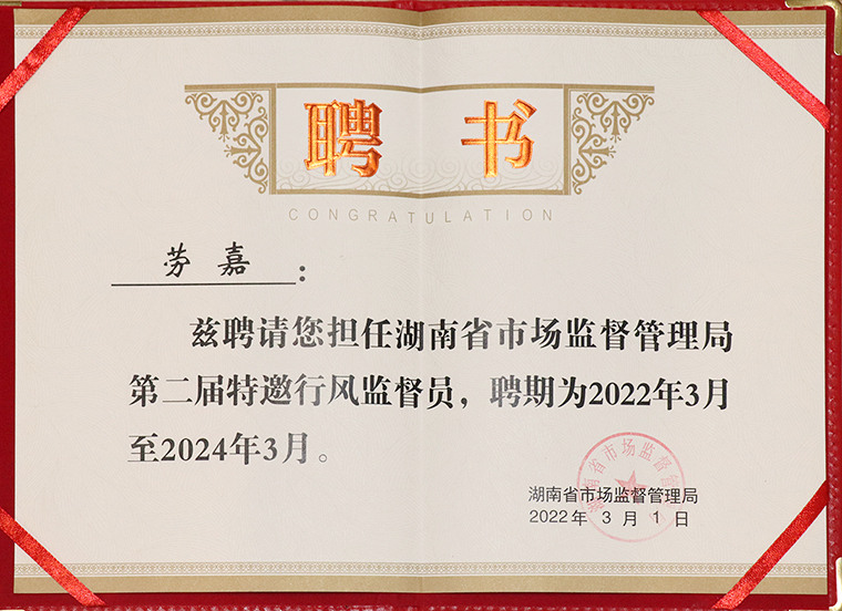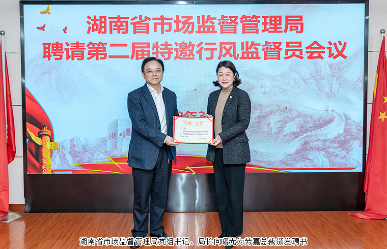 湖南省市場監(jiān)督管理局黨組成員、省藥監(jiān)局黨組書記梁毅恒宣讀了《關(guān)于省局干部隊(duì)伍作風(fēng)紀(jì)律教育整頓總體情況的通報(bào)》。湖南省市場監(jiān)督管理局副局長李沐宣讀聘請(qǐng)?zhí)匮酗L(fēng)監(jiān)督員的通知。勞嘉總裁受聘為湖南省市場監(jiān)督管理局第二屆特邀行風(fēng)監(jiān)督員。