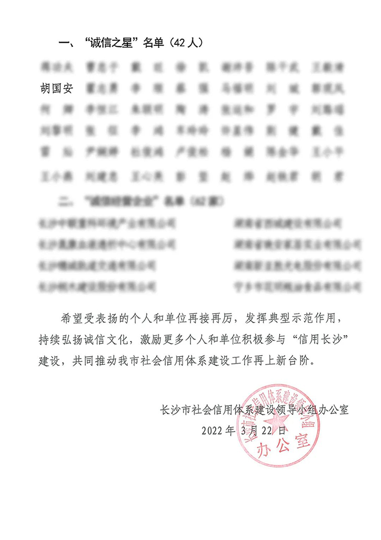 近日,長(zhǎng)沙市社會(huì)信用體系建設(shè)領(lǐng)導(dǎo)小組辦公室發(fā)布《關(guān)于表?yè)P(yáng)2021年度(總第二批)“誠(chéng)信之星”個(gè)人和“誠(chéng)信經(jīng)營(yíng)企業(yè)”等單位的通知》,綠之韻集團(tuán)董事長(zhǎng)胡國(guó)安憑借引領(lǐng)企業(yè)在誠(chéng)信體系建設(shè)領(lǐng)域所取得的優(yōu)異成果受到政府表彰,榮獲長(zhǎng)沙市“誠(chéng)信之星”榮譽(yù)表彰。