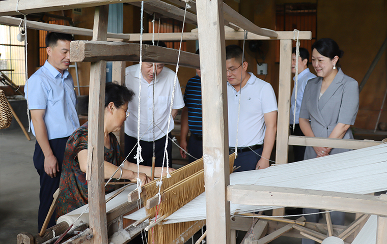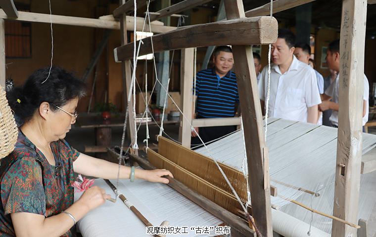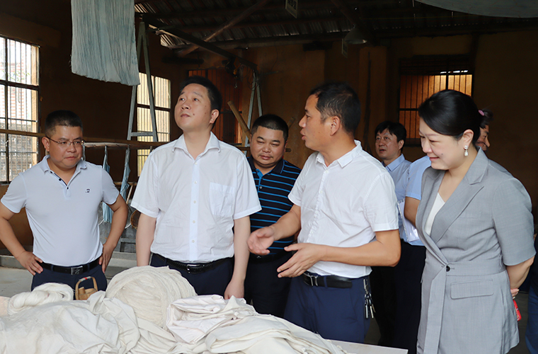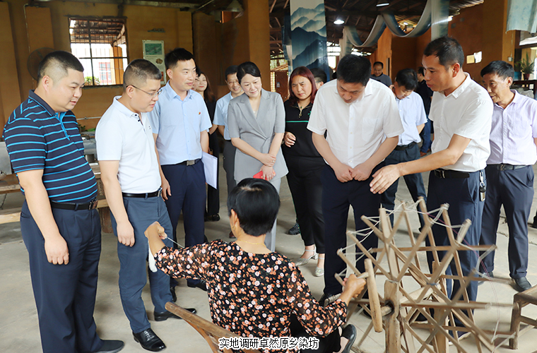 調(diào)研組一行首先來到卓然原鄉(xiāng)染坊就非遺傳承保護、文旅融合發(fā)展等工作進行考察,深入了解了原鄉(xiāng)染坊目前的經(jīng)營情況。原鄉(xiāng)染坊作為北盛鎮(zhèn)撈刀河畔·田園綜合體項目的旅游休閑項目,其織布、染色都是采用“古法”操作,即紡織女工們用木制紡車紡出一匹匹夏布后,染色師傅們再用從卓然村收購的荷花、荷葉、蓮蓬以及其他植物中提煉的染料給布匹著色。目前,染坊兼具生產(chǎn)、研學、文創(chuàng)三大功能,同時圍繞染坊延伸建造生態(tài)染織物種植基地、織染學院、織染博物館等文化新生態(tài)。