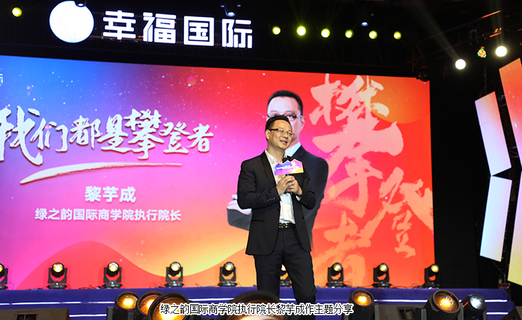 隨后,綠之韻國際商學(xué)院執(zhí)行院長黎芋成作《我們都是攀登者》主題分享,深入淺出地為現(xiàn)場家人們闡述了攀登與幸福蘊藏的內(nèi)涵。在全場熱烈的掌聲中,綠之韻集團副總裁、幸福導(dǎo)師夏運良講話。他表示,今天是幸福國際成立的三周年慶典,三周年不僅是一個乘勢而上的發(fā)展之年,更是一個三生萬物的希望之年。感恩在我們向前、向上的攀登之路上不斷給予我們支持的胡國安董事長、勞嘉總裁以及所有在背后為我們保駕護航的綠之韻同仁們;感恩每一位陪伴攀登的運營團隊,感恩每一位發(fā)展委、特聘市場講師、市場核心骨干以及每一位幸福代言人。幸福國際成立的三年里,我們攀登了一座又一座高峰。未來,幸福國際還會遇到很多考驗,我們始終要堅持對人才的長期主義、對產(chǎn)品的長期主義和對發(fā)展的長期主義。我們都是永不止步的攀登者,在攀登前行的過程中,有些事情我們一定要做:一要為綠之韻集團作出貢獻,成為一支召之即來、來之能戰(zhàn)的精英部隊;二要為市場作出貢獻,發(fā)現(xiàn)人才、培養(yǎng)人才,讓所有心懷夢想的人實現(xiàn)三無憂的幸福生活;三要為行業(yè)作出貢獻,以產(chǎn)品為導(dǎo)向,以服務(wù)為基石,成為正能量的存在;四要為社會作出貢獻,力所能及讓更多的人收獲幸福感;五要為國家作出貢獻,通過科技讓中醫(yī)養(yǎng)生走進千家萬戶,讓世界看見中醫(yī),讓中醫(yī)走向世界。每個時代都有向巔峰發(fā)起挑戰(zhàn)的人,也都有著屬于我們自己的攀登者的精神。我很幸運,任重道遠(yuǎn)的路上有每一位幸福代言人們陪著。謝謝你們!
