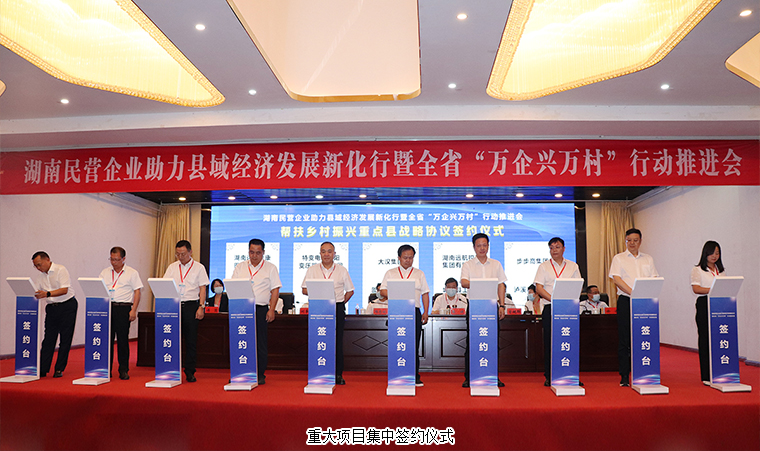 會(huì)上,進(jìn)行了關(guān)于“幫扶千村 破零倍增”重點(diǎn)幫扶集體經(jīng)濟(jì)薄弱村專項(xiàng)行動(dòng)和關(guān)于“民企興縣 跨越同行”助力鄉(xiāng)村振興重點(diǎn)幫扶縣專項(xiàng)行動(dòng)文件的說明;公布了幫扶新化縣100個(gè)薄弱村的民營(yíng)企業(yè)和商協(xié)會(huì)名單;簽訂了全省“萬企興萬村”行動(dòng)示范項(xiàng)目9個(gè)、幫扶新化縣項(xiàng)目10個(gè),涵蓋農(nóng)產(chǎn)品種植、鄉(xiāng)村旅游、美麗鄉(xiāng)村建設(shè)等方面,總投資超14億元。參與“民企興縣 跨越同行”行動(dòng)的150個(gè)企業(yè)、商協(xié)會(huì)與全省15個(gè)鄉(xiāng)村振興重點(diǎn)幫扶縣簽訂了《幫扶鄉(xiāng)村振興重點(diǎn)縣戰(zhàn)略協(xié)議》。100個(gè)民營(yíng)企業(yè)和商協(xié)會(huì)與100個(gè)幫扶新化縣薄弱村簽訂結(jié)對(duì)協(xié)議。會(huì)議還表揚(yáng)了一批在“商會(huì)進(jìn)新化 黨員聯(lián)鄉(xiāng)村”行動(dòng)中的優(yōu)秀商協(xié)會(huì)黨組織。簽約儀式上,勞嘉總裁代表綠之韻集團(tuán)與安化縣工商聯(lián)就鄉(xiāng)村振興建設(shè)工作簽訂了戰(zhàn)略協(xié)議。