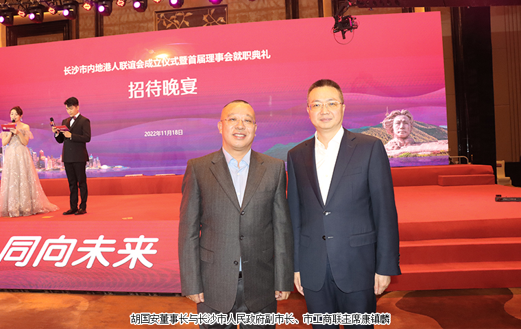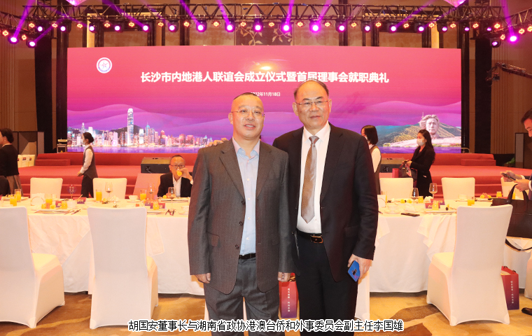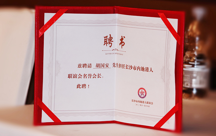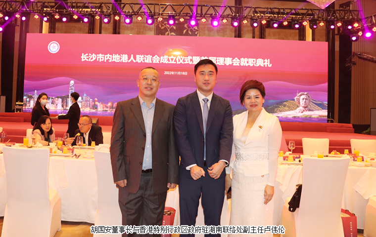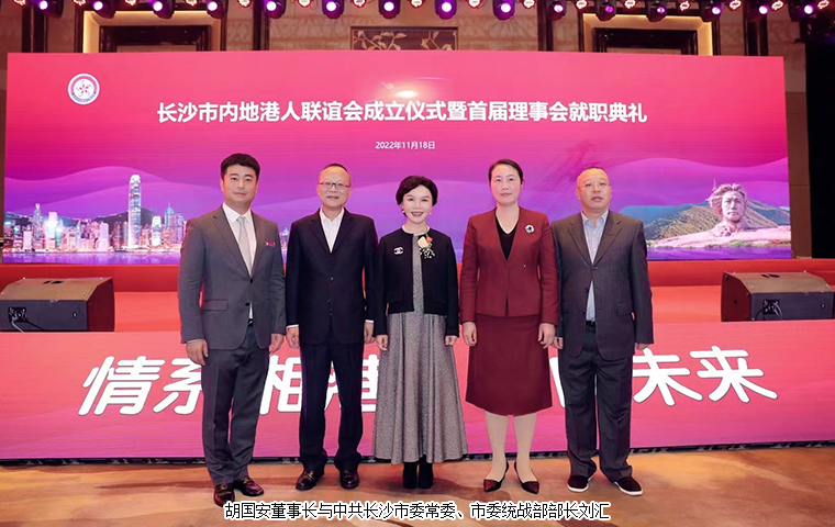 2022 年 11 月 18 日,長沙市內(nèi)地港人聯(lián)誼會成立儀式暨首屆理事會就職典禮舉行。中共湖南省委統(tǒng)戰(zhàn)部副部長、省社會主義學(xué)院黨組書記丁學(xué)新,湖南省政協(xié)港澳臺僑和外事委員會副主任李國雄,中共長沙市委常委、市委統(tǒng)戰(zhàn)部部長劉匯,長沙市人民政府副市長、市工商聯(lián)主席康鎮(zhèn)麟,長沙市政協(xié)副主席、黨組成員劉金文,中共長沙市雨花區(qū)委書記劉素月,香港特別行政區(qū)政府駐湖南聯(lián)絡(luò)處副主任盧偉倫等領(lǐng)導(dǎo)出席活動。湖南省政協(xié)委員、湖南省慈善總會副會長、香港長沙聯(lián)誼會名譽(yù)會長(代理會長)、香港長沙商會常務(wù)副會長,長沙市海外聯(lián)誼會常務(wù)副會長,綠之韻集團(tuán)董事長胡國安先生受邀擔(dān)任活動主禮嘉賓并受聘為長沙市內(nèi)地港人聯(lián)誼會名譽(yù)會長。