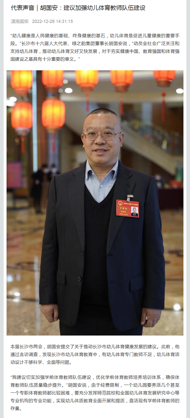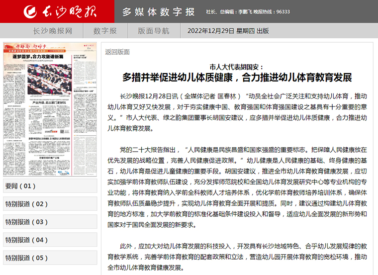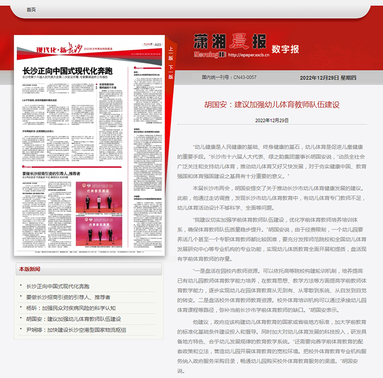 會(huì)議期間,胡國安代表廣泛同各界別代表們分別圍繞市委、市政府的中心工作,聚焦長沙現(xiàn)代化新征程和人民群眾普遍關(guān)心的重點(diǎn)問題,進(jìn)行深入探討和交流。此次會(huì)議,他提交了《關(guān)于推進(jìn)我市“四好農(nóng)村路”高質(zhì)量發(fā)展的建議》和《關(guān)于推進(jìn)我市幼兒體育教育健康發(fā)展的建議》兩件議案。推進(jìn)“四好農(nóng)村路”高質(zhì)量發(fā)展是貫徹落實(shí)黨的二十大報(bào)告所提出的“交通強(qiáng)國”“增進(jìn)民生福祉”的重要舉措,是實(shí)現(xiàn)脫貧攻堅(jiān)、鄉(xiāng)村振興和農(nóng)業(yè)農(nóng)村現(xiàn)代化的客觀要求,更是改善農(nóng)村人居環(huán)境,提高人民群眾幸福度和滿意度的應(yīng)有之義。胡國安代表建議要按照技術(shù)標(biāo)準(zhǔn),推動(dòng)農(nóng)村內(nèi)部道路建設(shè)升級(jí);要加快立法調(diào)研,修訂《長沙市公路管理規(guī)定(2010)》;要拓寬籌資渠道,引導(dǎo)社會(huì)資本廣泛參與;要加強(qiáng)設(shè)計(jì)施工融合,探索推行EPC承包模式;要盡快專門立法,加強(qiáng)長沙市農(nóng)村公路養(yǎng)護(hù)?!蛾P(guān)于推進(jìn)我市幼兒體育教育健康發(fā)展的建議》中,建議切實(shí)加強(qiáng)學(xué)前體育教師隊(duì)伍建設(shè),優(yōu)化學(xué)前體育教師培養(yǎng)培訓(xùn)體系,確保體育教師隊(duì)伍質(zhì)量穩(wěn)步提升;政府應(yīng)該構(gòu)建幼兒體育教育的國家或省級(jí)地方標(biāo)準(zhǔn),加大學(xué)前教育的標(biāo)準(zhǔn)化基礎(chǔ)條件建設(shè)投入和督導(dǎo);加大對(duì)幼兒體育發(fā)展的科技投入,研發(fā)具備地方特色、合乎幼兒發(fā)展規(guī)律的教育教學(xué)系統(tǒng);完善學(xué)前體育教育的配套政策和立法,營造幼兒園開展體育教育的寬松環(huán)境。胡國安代表今年的兩件議案,內(nèi)容緊扣當(dāng)前焦點(diǎn)熱點(diǎn)話題,受到與會(huì)代表的廣泛認(rèn)同,引發(fā)多家新聞媒體聚焦報(bào)道。