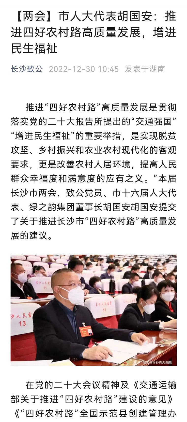 奮進(jìn)新征程,推進(jìn)現(xiàn)代化。2022年12月27-30日,備受矚目的長沙市第十六屆人民代表大會(huì)第二次會(huì)議在長沙人民會(huì)堂勝利召開。長沙市人大代表、湖南省長沙市光彩事業(yè)基金會(huì)理事長、綠之韻集團(tuán)董事長胡國安與來自長沙各條戰(zhàn)線的市人大代表,肩負(fù)著全市人民的信任和重托,滿懷豪情匯聚一堂,共商長沙發(fā)展大計(jì),共繪長沙美好明天。