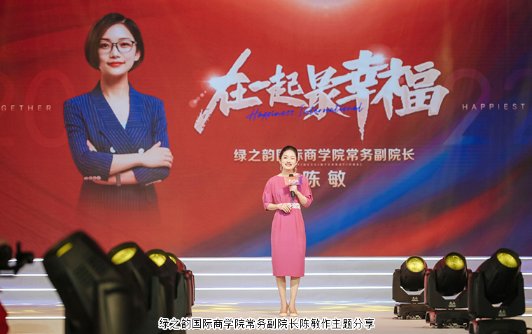 隨后,綠之韻國際商學(xué)院常務(wù)副院長陳敏作《在一起,最幸?!返闹黝}分享,與綠之韻事業(yè)伙伴們一起回顧了綠之韻幸福國際第一個(gè)三年成長路上的幸福縮影。