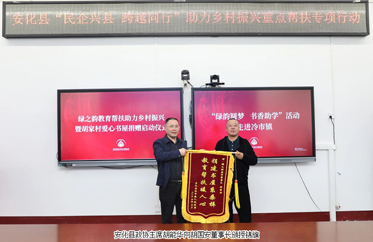 鄉(xiāng)村振興,教育先行。綠之韻集團董事長胡國安表示,助力鄉(xiāng)村振興重點縣專項行動是落實中央、省委鄉(xiāng)村振興戰(zhàn)略的重要舉措,我們民營企業(yè)家更要增強家國情懷,促進共同富裕的責任感和使命感。作為一名從安化大山里走出的企業(yè)家,積極投身到建設(shè)家鄉(xiāng)的事業(yè)中去,是我與生俱來的責任與使命。一直以來,綠之韻集團始終堅持把公益事業(yè)上升到企業(yè)發(fā)展戰(zhàn)略高度,積極探索新時代公益新模式,從關(guān)注個體,提升為關(guān)注社會發(fā)展、融入國家戰(zhàn)略。教育幫扶一直是綠之韻公益基金會的重要關(guān)注點之一。近年來,綠之韻在全國各地先后援建了11所希望學校,陸續(xù)投入1000萬元開展“樹人行動”,投入300萬元在全國各地開展“綠韻圓夢?書香助學”活動,投入1000萬元用于女性關(guān)愛活動,從“萬企幫萬村”到“萬企興萬村”,綠之韻集團支援安化的足跡遍布安化高明鄉(xiāng)、古樓鄉(xiāng)、冷市鎮(zhèn)、江南鎮(zhèn)、煙溪鎮(zhèn)等地,項目涉及賑災濟困、興教助學、孤殘救助、醫(yī)療衛(wèi)生、修路飲水、養(yǎng)老醫(yī)療、中藥材種植加工等,累計向安化縣捐贈款物近600萬元,參與各類社會公益事業(yè)累計捐贈款物7600多萬元。同時,綠之韻一直把創(chuàng)建“學習型企業(yè)”作為企業(yè)戰(zhàn)略性發(fā)展的著力點。今天綠之韻在安化冷市鎮(zhèn)開展書香助學行動,既是響應湖南省“民企興縣 跨越同行”助力鄉(xiāng)村振興重點幫扶縣專項行動,也希望書屋建設(shè)能夠進一步豐富村民的業(yè)余生活,引導村民及學生共建學習型群體,形成愛讀書、讀好書的學習習慣,助力鄉(xiāng)村文化振興。這所愛心書屋在落成后,會定期開設(shè)主題研學活動。后續(xù)還將在安化大橋?qū)W校設(shè)立專項獎學金,為家鄉(xiāng)的鄉(xiāng)村振興建設(shè)工作儲備更多優(yōu)質(zhì)人才。他希望,胡家村愛心書屋可以提升家鄉(xiāng)人民的生活幸福感、獲得感。同時,也能為孩子們點亮一盞燈、打開一扇門,在縣城里也能看到外面的世界和遠方。未來,他將繼續(xù)帶領(lǐng)綠之韻集團積極參與安化鄉(xiāng)村振興建設(shè),并通過書香助學行動影響和帶動更多的愛心人士和企業(yè)加入到建設(shè)家鄉(xiāng)的行列,為安化美麗鄉(xiāng)村的建設(shè)貢獻出自己的一份力量。
