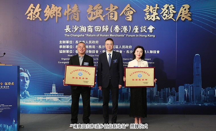以鄉(xiāng)情為紐帶,以產(chǎn)業(yè)為依托,本次座談會(huì)重在“小而精”、“點(diǎn)對(duì)點(diǎn)”招商,重點(diǎn)突出現(xiàn)代服務(wù)業(yè)、科技、金融、文化旅游等產(chǎn)業(yè)的合作。座談會(huì)上,長(zhǎng)沙市商務(wù)局、雨花區(qū)分別作市情、區(qū)情推介。為更好發(fā)揮商會(huì)在招商引資工作中的橋梁與紐帶作用,座談會(huì)現(xiàn)場(chǎng),長(zhǎng)沙市人民政府副市長(zhǎng)、市工商聯(lián)主席康鎮(zhèn)麟為香港長(zhǎng)沙聯(lián)誼會(huì)、長(zhǎng)沙內(nèi)地港人聯(lián)誼會(huì)授牌“湘商回歸和返鄉(xiāng)創(chuàng)業(yè)聯(lián)絡(luò)站”。聯(lián)絡(luò)站將主動(dòng)對(duì)接粵港澳朋友圈,搭建湘籍企業(yè)家溝通、交流、回鄉(xiāng)的橋梁,推動(dòng)長(zhǎng)沙與粵港澳大灣區(qū)湘商企業(yè)家的深度交流與合作?!跋愀坶L(zhǎng)沙聯(lián)誼會(huì)將積極發(fā)揮引領(lǐng)和示范作用,引導(dǎo)和帶動(dòng)粵港澳大灣區(qū)‘骨干’企業(yè)投資長(zhǎng)沙?!毕愀坶L(zhǎng)沙聯(lián)誼會(huì)名譽(yù)會(huì)長(zhǎng)、綠之韻集團(tuán)董事長(zhǎng)胡國(guó)安表示,聯(lián)誼會(huì)將助力推進(jìn)湘商產(chǎn)業(yè)回歸、資本回流、項(xiàng)目回投、人才回聚、總部回建。