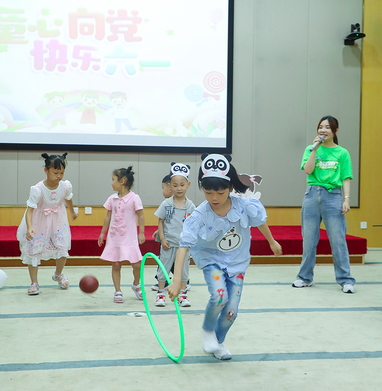 彩色主題墻、彩色氣球?qū)⒒顒?dòng)現(xiàn)場(chǎng)裝扮得充滿著濃濃的節(jié)日氛圍。工作人員穿上玩偶服,裝扮成“韻小寶”、“小兔子”,為她們送上五彩繽紛的氣球和節(jié)日的祝福。在“圈圈接力賽”、“重走長(zhǎng)征路”、“滾圈圈”等一系列親子小游戲中,家長(zhǎng)與孩子密切配合、相互協(xié)作,全場(chǎng)成為一片歡樂(lè)的海洋;孩子們自信地展示自己的才藝,跳街舞、即興籃球表演、背誦唐詩(shī)......孩子們?cè)谖枧_(tái)上閃閃發(fā)光,出色的表演,贏得滿場(chǎng)喝彩與掌聲。
