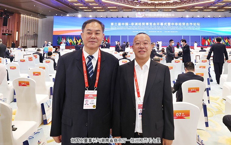 2023年6月29日,由中華人民共和國(guó)商務(wù)部與湖南省人民政府共同主辦的第三屆中國(guó)-非洲經(jīng)貿(mào)博覽會(huì)在長(zhǎng)沙隆重開(kāi)幕。國(guó)家副主席韓正出席開(kāi)幕式并致辭。馬拉維總統(tǒng)查克維拉、坦桑尼亞桑給巴爾總統(tǒng)姆維尼、非洲大陸自貿(mào)區(qū)秘書(shū)長(zhǎng)梅內(nèi),中共湖南省委書(shū)記沈曉明,省委副書(shū)記、省長(zhǎng)毛偉明,全國(guó)婦聯(lián)副主席、書(shū)記處第一書(shū)記黃曉薇,省政協(xié)主席毛萬(wàn)春等領(lǐng)導(dǎo)出席開(kāi)幕式。長(zhǎng)沙市人大代表、中國(guó)國(guó)際商會(huì)湖南商會(huì)副會(huì)長(zhǎng)、湖南省慈善總會(huì)副會(huì)長(zhǎng)、綠之韻集團(tuán)董事長(zhǎng)胡國(guó)安受邀參加開(kāi)幕式,與來(lái)自68個(gè)國(guó)家和地區(qū)的1000多名各界代表匯聚一堂,共同探索更多新技術(shù)、新產(chǎn)業(yè)、新業(yè)態(tài)、新模式的國(guó)際合作。