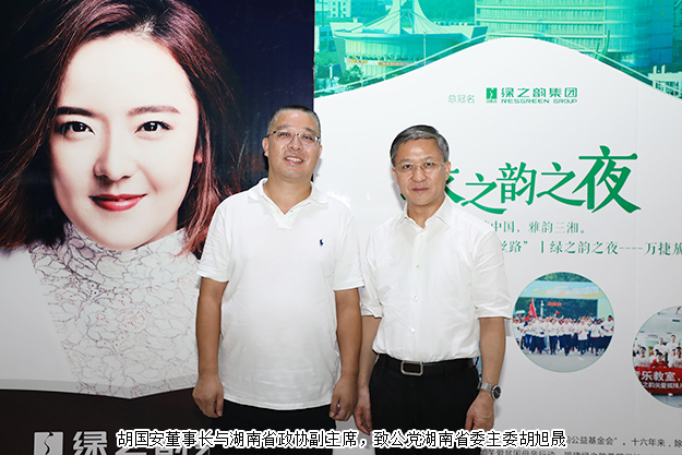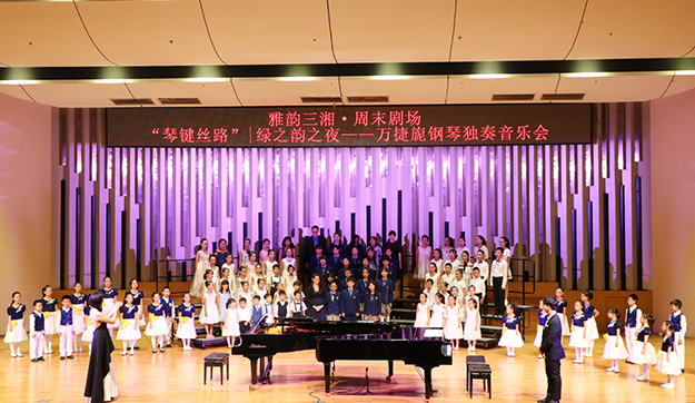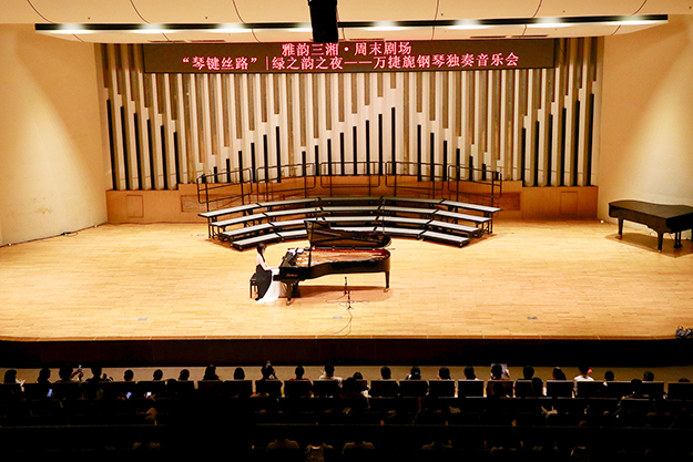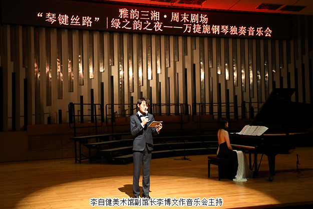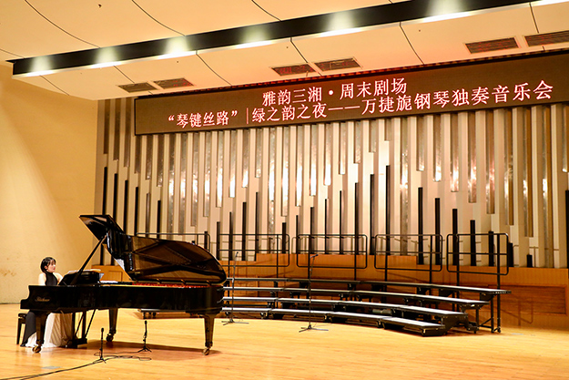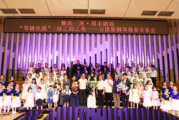 2019年8月24日晚,由湖南省委宣傳部、湖南省文化和旅游廳、湖南省教育廳、湖南省廣播電視臺、湖南省演藝集團聯(lián)合主辦,綠之韻集團總冠名的“綠之韻之夜·萬捷旎鋼琴獨奏音樂會”在湖南音樂廳舉行。湖南省政協(xié)副主席、致公黨湖南省委主委胡旭晟,湖南省演藝集團黨委書記吳友云、總經(jīng)理胡俊,湖南省政協(xié)委員、綠之韻集團董事長胡國安,綠之韻集團董事總裁、湖南省綠之韻公益基金會理事長勞嘉等領導親臨音樂會現(xiàn)場,跟隨旅德青年鋼琴演奏家萬捷旎的美妙琴聲,和樂迷朋友一起領略“中外作曲家筆下的中國”。