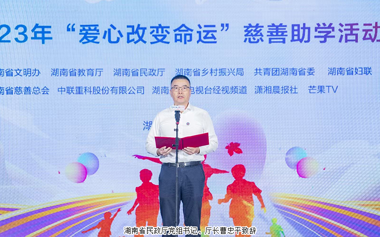 活動現(xiàn)場播放了“愛心改變命運”2023年主題視頻以及湖南14個市州慈善會助學成果視頻。湖南省民政廳黨組書記、廳長曹忠平致辭。他在致辭中指出,慈善事業(yè)是一項獻愛心、暖人心、惠民生的崇高事業(yè)。人生之善莫過于助人,助人之德莫過于助學,慈善助學是改變困境學子的希望霞光。他呼吁,社會各界攜起手來,共同加入“愛心改變命運”慈善助學行動,用博大的愛心澆灌未來。