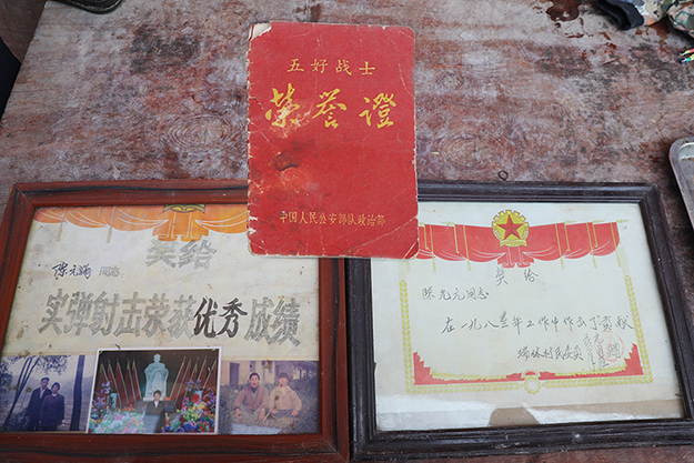看到我們的到來,老人很是自豪地從柜子里翻出自己曾經在部隊里獲得“五好戰(zhàn)士”和“實彈射擊優(yōu)秀成績”的榮譽證書和獎狀。50余載的歲月走過,已經泛黃的獎狀被老人很用心的封存在相框中;紅底黃字的“五好戰(zhàn)士”榮譽證,薄薄的一張小紙片,邊角已經磨損,幾道深深的折痕,留下了歲月的痕跡,但那精神在老人娓娓道來的敘述聲中依然鮮活。