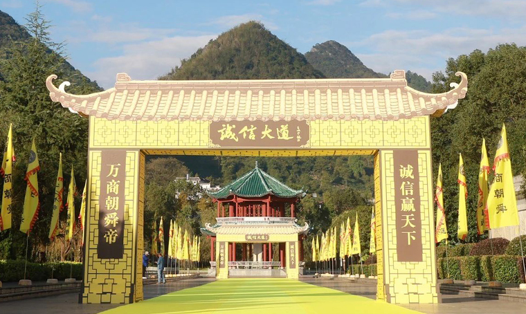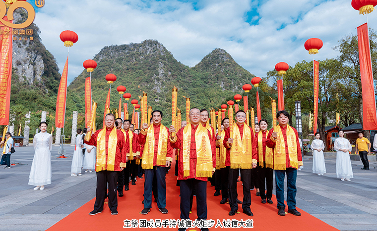 仲秋時令的清晨,舜帝陵一派莊嚴肅穆的景象。九龍柱廣場,瑤歌迎賓隊整齊列陣,鼓號激昂誠信大道南端,紅色空飄迎風(fēng)招展……參加祭祖大典的千余名嘉賓匯集在九龍柱入口處進行誠信簽名,整隊列陣。在舜帝陵園入口,瑤族少女唱起了瑤家迎賓歌,為嘉賓敬獻甘甜純美的瓜簞酒;主祭人胡國安與主祭團成員手持誠信火炬帶領(lǐng)大家走過誠信大道,到達舜帝陵祭祀廣場。