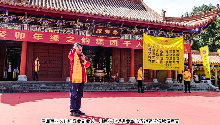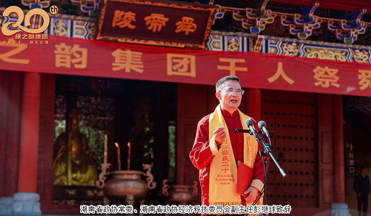 隨后,湖南省政協(xié)常委、湖南省政協(xié)經(jīng)濟科技委員會副主任彭繼球致辭。他代表湖南省政協(xié),向長期以來關(guān)心支持湖南發(fā)展的各界人士表示衷心感謝。他表示,舜帝是中華民族的人文始祖,也是中華商業(yè)文明的開創(chuàng)者和誠信的首倡者。我們要學(xué)習(xí)貫徹習(xí)近平總書記關(guān)于“企業(yè)家要做誠信守法的表率,帶動全社會道德素質(zhì)和文明程度提升”的重要指示精神,挖掘中華民族五千年來未曾斷流的舜帝誠信文化資源,講好舜帝誠信故事。今天千余名商界精英齊聚九嶷山舉辦祭祀舜帝大典對于繼承和弘揚舜德文化、企業(yè)高質(zhì)量創(chuàng)新發(fā)展都是十分有意義。綠之韻集團是繼2022年湖南省公祭大典和2023年萬商朝舜祭舜大典后,第一家舉行大型民間祭舜活動的民營企業(yè)。作為委員企業(yè),綠之韻集團在胡國安董事長帶領(lǐng)下,20年來始終誠信經(jīng)營,做到了守合同重信用。同時,在企業(yè)發(fā)展壯大的時候,不忘回報社會,勇于發(fā)揮光彩事業(yè)精神,這其實就是舜德誠信文化最好的詮釋。他希望,在場所有企業(yè)家,要繼續(xù)弘揚誠信文化,促進企業(yè)高質(zhì)量發(fā)展,為以中國式現(xiàn)代化實現(xiàn)中華民族偉大復(fù)興,加快建設(shè)社會主義現(xiàn)代化新湖南作出自己應(yīng)有的貢獻。