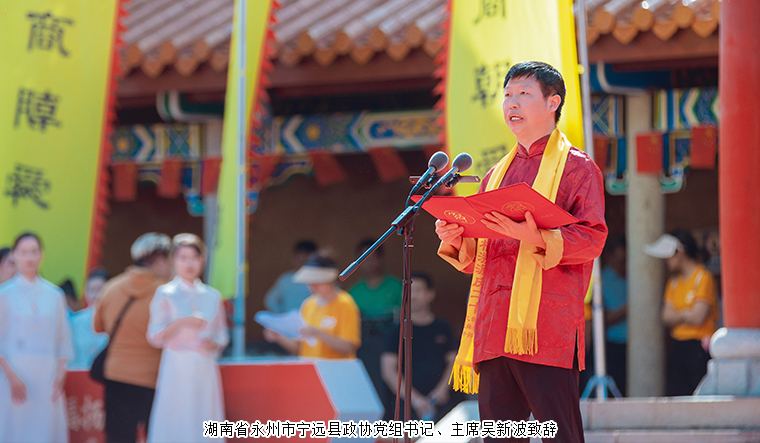 盛世景明,金風(fēng)送爽。上午十時整,湖南衛(wèi)視著名主持人李兵主持慶典儀式。湖南省永州市寧遠縣政協(xié)黨組書記、主席吳新波致辭。他首先代表寧遠縣委縣政府向大家的到來表示熱烈的歡迎和衷心的感謝。今年5月以來,“萬商朝舜”活動秉持弘揚中華優(yōu)秀傳統(tǒng)文化的精神,成功舉辦了取火儀式、啟動儀式、全球湘商祭舜大典等大型活動,面向全球傳播舜帝誠信經(jīng)商的理念,受到了社會各界的高度贊譽,在海內(nèi)外產(chǎn)生了廣泛的影響。綠之韻集團一直堅持的“和誠立信,競超興業(yè)”的企業(yè)理念與舜帝四千年前所倡導(dǎo)的經(jīng)商理念和商業(yè)文化一脈相承。綠之韻集團舉行癸卯年千人祭祀舜帝慶典,既是尋根溯源、培根鑄魂的朝圣之旅,也是弘揚舜德誠信文化的益善之行,更是一次飲水思源的感恩回饋之舉,是對“萬商朝舜”與誠信精神的積極響應(yīng),必定會感召更多力量弘揚舜德精神,形成“萬商朝舜·萬商來湘”新格局。希望更多的企業(yè)來到九嶷山祭舜,共同把九嶷山打造成為中華民族的誠信基地、道德高地、精神家園!