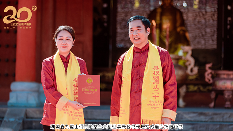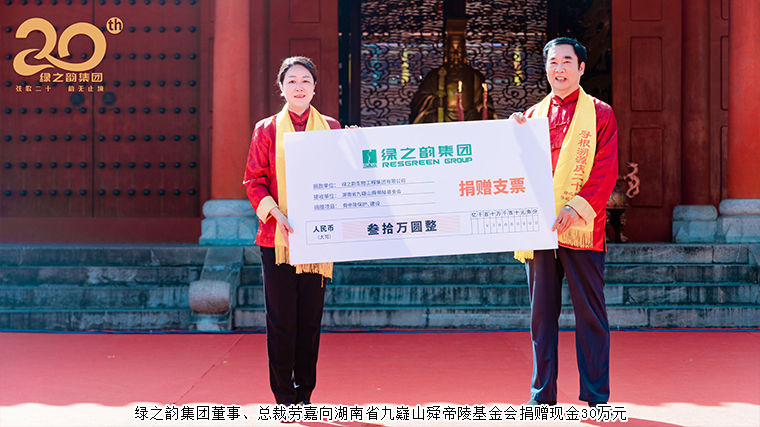 大江奔流,澤被兩岸。正本溯源,是為了更好地創(chuàng)新發(fā)展;追尋文化歷史,是為了更好地出發(fā)。儀式上,綠之韻集團董事總裁,綠之韻公益基金會理事長勞嘉代表綠之韻集團向湖南省九嶷山舜帝陵基金會捐贈現(xiàn)金30萬元,為保護和建設(shè)舜帝陵貢獻一份力量。湖南省九嶷山舜帝陵基金會副理事兼秘書長唐松成接牌,并頒發(fā)捐贈證書。