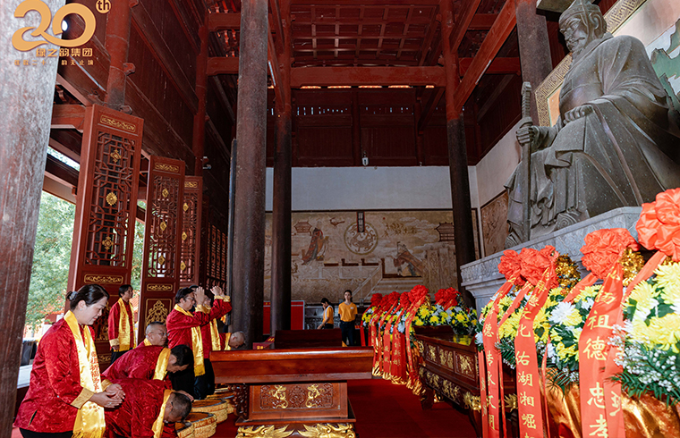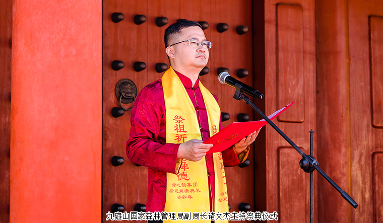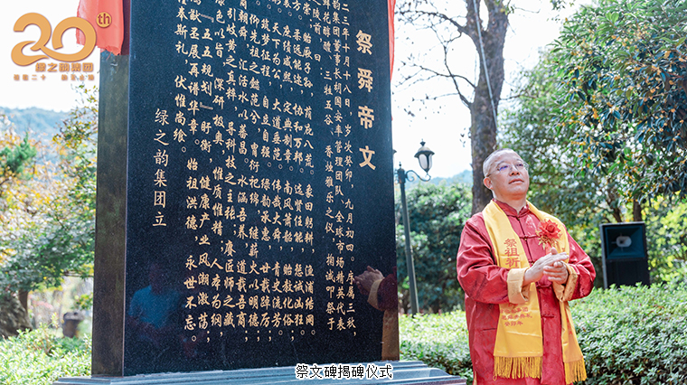 上午10:38,祭祀典禮正式開始,九山國家森林管理局副局長諸文杰主持儀式并宣布:“癸卯年全球湘商祭舜大典開始。祭舜大典儀式共有九項儀程。擊鼓9通,鳴金3響;禮生向中華民族始祖舜帝敬獻祭品,一獻三牲,再獻五谷,三獻百果;主祭人胡國安盥手、敬獻香火、貢酒;全體肅立,向舜帝圣像三鞠躬,虔誠致敬。在莊嚴肅穆的氣氛中,胡國安恭讀《祭舜帝文》:“穆穆舜帝,功峻德崇;貽厥子孫,蔭庇八荒……綠韻承惠,廿載踔厲;芳華待灼,其勢湯湯。仰先祖之懿范兮,胄衍祀綿,繼薪火以明德;啟誠信之輝光兮,萬商朝舜,匯活水以蕃昌。水涵吾養(yǎng),道載吾商;意同道合,實業(yè)興邦?!弊肿志渚洌灀P了舜帝開創(chuàng)道德文明的豐功偉績;表達綠之韻將秉承舜德精神,用心踐行“和誠立信、競超興業(yè)”的企業(yè)品格,努力為實現(xiàn)企業(yè)高質(zhì)量發(fā)展,為社會作出應(yīng)有的貢獻。