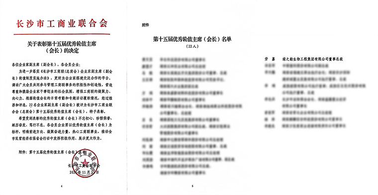 會議集中表彰了一批優(yōu)秀個人、企業(yè)和商會。胡國安董事長作為湖南省長沙市光彩事業(yè)基金會理事長,帶領(lǐng)綠之韻集團在推動企業(yè)高質(zhì)量發(fā)展的同時,以高度的責(zé)任感和使命感,積極投身鄉(xiāng)村振興、愛心助學(xué)等公益事業(yè),在光彩事業(yè)工作中表現(xiàn)突出并做出重要貢獻,綠之韻集團被長沙市工商業(yè)聯(lián)合會(總商會)授予“光彩事業(yè)先進民營企業(yè)”稱號。根據(jù)輪值會長的日常考勤和專題活動履職情況,經(jīng)過推薦和評選,勞嘉總裁等22名企業(yè)家副主席(副會長)被評為長沙市工商業(yè)聯(lián)合會(總商會)第十五屆優(yōu)秀輪值主席(會長)。