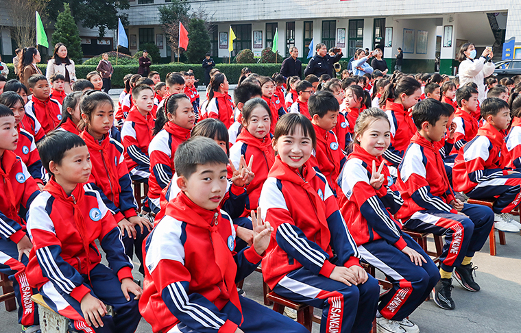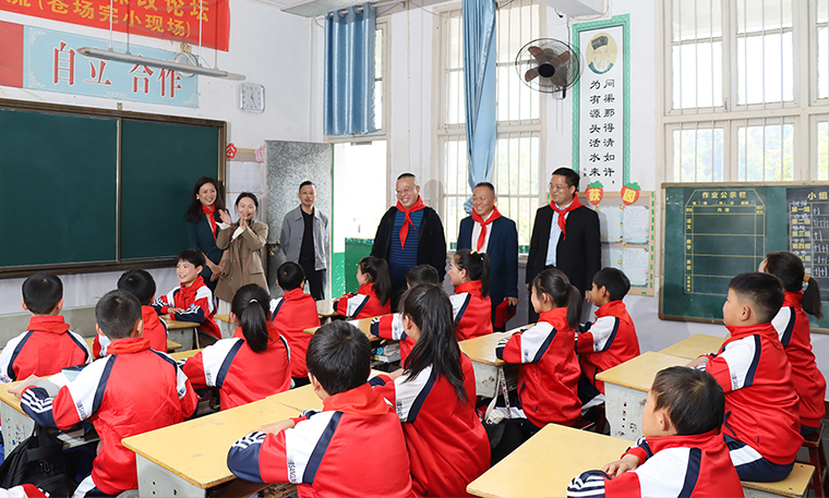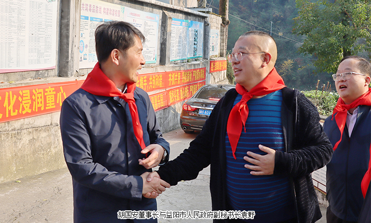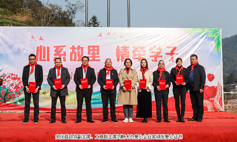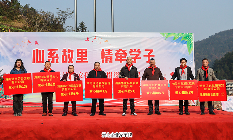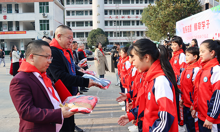 活動伊始,少先隊員們?yōu)榈綀黾钨e佩戴紅領(lǐng)巾,行隊禮,用行動向愛心企業(yè)和人士表達誠摯的感謝。愛心捐贈儀式上,馬路鎮(zhèn)中心學校黨支部書記、校長黃攀峰在致辭中感謝了長沙市安化商會以綠之韻為代表的諸多愛心企業(yè)與愛心志愿者們對學校及孩子們的關(guān)愛與幫助。隨后,長沙市安化商會會長、綠之韻集團董事長胡國安與長沙市安化商會黨支部書記、執(zhí)行會長吳余生向馬路鎮(zhèn)蒼場完小、東坪完小捐贈50萬元的現(xiàn)金支票。安化縣政協(xié)副主席、工商聯(lián)主席劉暢術(shù),安化縣教育局黨組書記、局長陳羽成為愛心企業(yè)頒發(fā)捐贈證書。