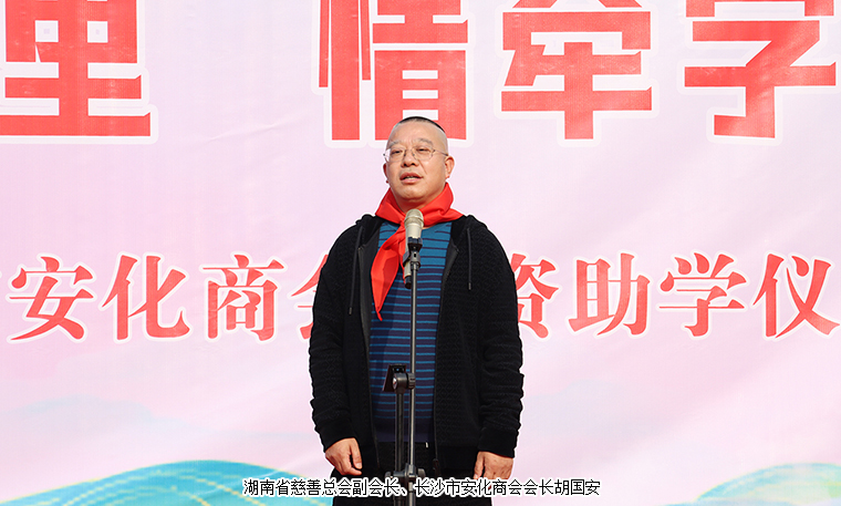 捐贈儀式上,胡國安會長講話。他首先向參加活動的領(lǐng)導致以真摯的感謝,向辛勤耕耘在教育一線的學校各位領(lǐng)導和老師致以崇高的敬意,向家鄉(xiāng)的父老鄉(xiāng)親和同學們表示親切的問候。建設(shè)家鄉(xiāng),回報桑梓是我們每一個安化人的夢想。長沙市安化商會積極作為,主動承擔非公經(jīng)濟企業(yè)的社會責任,組織會員積極參加公益活動,累計捐贈款物近900萬元。作為從安化大山里走出的企業(yè)家,積極投身到建設(shè)家鄉(xiāng)的事業(yè)中去,是我們與生俱來的責任與使命。今天我們在安化馬路鎮(zhèn)蒼場完小和東坪鎮(zhèn)完全小學捐贈50萬元愛心款項,為改善學校教學環(huán)境和條件提供力所能及的幫助,給予那些品學兼優(yōu)的學生和辛苦耕耘的老師更多鼓勵和學習的機會,希望營造濃厚的關(guān)心教育和培養(yǎng)人才的濃厚氛圍。同時,也希望學校的優(yōu)秀師生代表可以堅定理想信念,樹立遠大抱負,把這份殷殷愛心轉(zhuǎn)化為成才之志、奮發(fā)之源,在建設(shè)家鄉(xiāng)、投身鄉(xiāng)村振興、回報社會的生動實踐中放飛青春夢想。希望每一個走出安化的人都可以不忘家鄉(xiāng)養(yǎng)育之恩,大力支持家鄉(xiāng)各項事業(yè)發(fā)展,為建設(shè)新時代高質(zhì)量、富饒美麗的安化貢獻一份力量。