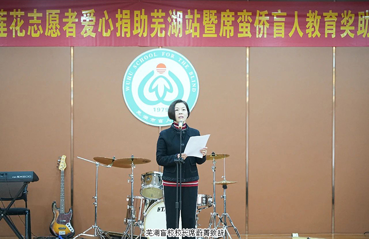 校長(zhǎng)席蔚菁先后榮獲蕪湖市“優(yōu)秀園丁”、“優(yōu)秀校長(zhǎng)”,安徽省“優(yōu)秀民辦學(xué)校校長(zhǎng)”光榮稱號(hào)。在活動(dòng)開始為大家講述了盲校的由來(lái)和初心,讓我們更能深入了解,幫困助學(xué)。