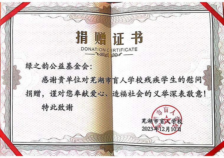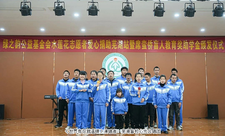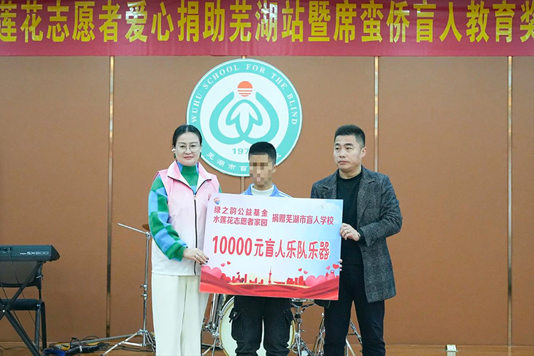 綠之韻水蓮花公益專項(xiàng)基金愛心捐助2023年度蕪湖盲校席蠻僑盲人教育助學(xué)金共30000元,以及10000元樂器和5000元的零食禮包。