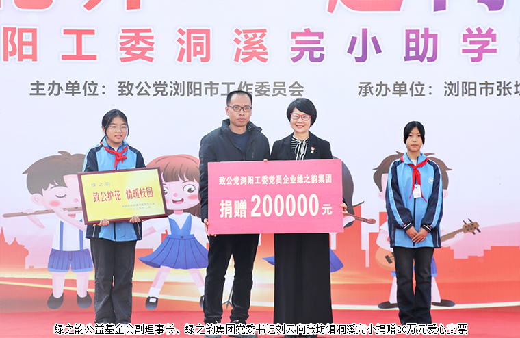 同心赴花開,一起向未來(lái)。儀式上,胡國(guó)安董事長(zhǎng)表示,每次來(lái)到學(xué)校開展公益活動(dòng)都會(huì)回想起自己的過(guò)去。幾十年前,他與在座各位一樣出生在一個(gè)普普通通的小山村,靠著讀書勇敢地走出了大山。趕上改革開放的春風(fēng),他創(chuàng)辦了綠之韻這家企業(yè)?!捌髽I(yè)小的時(shí)候是自己的,做到一定大的時(shí)候就是國(guó)家的、是社會(huì)的?!本G之韻集團(tuán)董事長(zhǎng)胡國(guó)安在接受媒體采訪時(shí)這樣說(shuō)道。20年前,綠之韻集團(tuán)在瀏陽(yáng)這片紅色沃土扎根,在瀏陽(yáng)各級(jí)領(lǐng)導(dǎo)的關(guān)心和支持下,秉持著“關(guān)愛生命 造福人類”的發(fā)展理念,在發(fā)展實(shí)業(yè)的同時(shí),積極承擔(dān)社會(huì)責(zé)任,產(chǎn)業(yè)富民,回饋社會(huì)。陸續(xù)開展了希望學(xué)校、愛心圖書館、關(guān)愛困難母親、綠+兒童關(guān)愛、鄉(xiāng)村振興等100多項(xiàng)公益項(xiàng)目,累計(jì)捐贈(zèng)款物8200多萬(wàn)元。他表示,少年強(qiáng)則國(guó)強(qiáng),青少年是祖國(guó)的希望與未來(lái)。教育幫扶一直是綠之韻公益基金會(huì)的重要關(guān)注點(diǎn)之一。今天,在張坊鎮(zhèn)洞溪完小開展“致公助學(xué)”活動(dòng)捐贈(zèng)20萬(wàn)元愛心款項(xiàng),是用于致公蓓蕾書屋和致公助學(xué)勞動(dòng)實(shí)踐基地的建設(shè),為改善學(xué)校教學(xué)環(huán)境和條件提供力所能及的幫助,營(yíng)造濃厚的關(guān)心教育和培養(yǎng)人才的濃厚氛圍。未來(lái),綠之韻將繼續(xù)關(guān)注青少年的成長(zhǎng),影響和帶動(dòng)更多的愛心企業(yè)及人士關(guān)注教育事業(yè),參與到“致公助學(xué)”的行動(dòng)中來(lái),讓更多的孩子都能夠在關(guān)愛和溫暖中健康成長(zhǎng),為繪就中國(guó)式現(xiàn)代化的瀏陽(yáng)圖景貢獻(xiàn)一份力量。