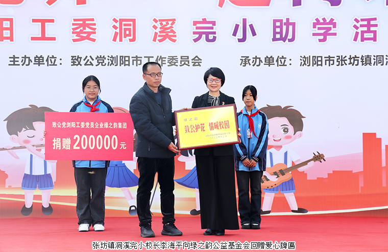 活動(dòng)伊始,中共瀏陽(yáng)市張坊鎮(zhèn)黨委副書記、鎮(zhèn)長(zhǎng)石盼在致辭中感謝了致公黨長(zhǎng)沙市委、瀏陽(yáng)市委以及愛心企業(yè)綠之韻對(duì)學(xué)校及孩子們的關(guān)愛與幫助。致公黨瀏陽(yáng)工委主委、科技局局長(zhǎng)鄧恩介紹助學(xué)情況。隨后,綠之韻公益基金會(huì)副理事長(zhǎng)、綠之韻集團(tuán)黨委書記劉云上臺(tái)向張坊鎮(zhèn)洞溪完小捐贈(zèng)20萬(wàn)元愛心支票。張坊鎮(zhèn)洞溪完小校長(zhǎng)李海平向綠之韻公益基金會(huì)回贈(zèng)愛心牌匾。