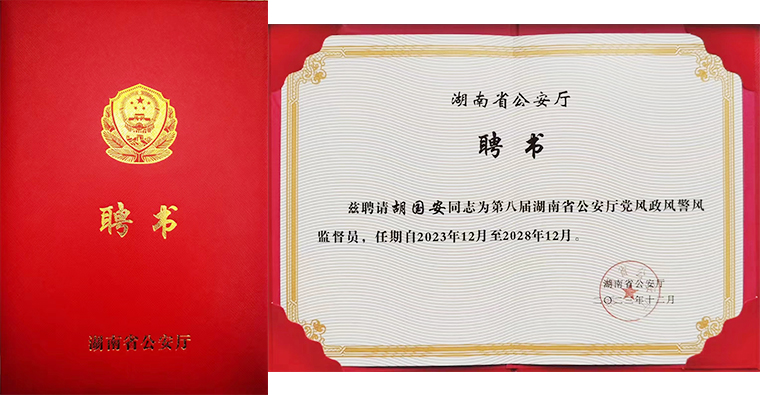 再次被受聘為湖南省公安廳黨風(fēng)政風(fēng)警風(fēng)監(jiān)督員,胡國(guó)安董事長(zhǎng)深感責(zé)任重大。他表示,一直以來(lái),他對(duì)監(jiān)督員的身份始終葆有一種神圣的使命感和責(zé)任感。這份聘書(shū)是沉甸甸的,不僅是一種光榮,更肩負(fù)著廣大普通民眾的矚托。未來(lái),他一定不辜負(fù)湖南省公安廳黨委的期望,不辜負(fù)廣大民眾的重托,依法依規(guī)行使監(jiān)督員的職責(zé),當(dāng)好人民的“調(diào)研員”,深入調(diào)研了解廣大群眾對(duì)公安工作的意見(jiàn)和建議;當(dāng)好人民的“查糾員”,行使好監(jiān)督員的群眾監(jiān)督作用;當(dāng)好人民的“參謀員”,向公安機(jī)關(guān)傳送群眾的呼聲和期盼、積極建言獻(xiàn)策;當(dāng)好人民的“宣傳員”,幫助講好警察故事,積極引導(dǎo)社會(huì)各界理解、支持公安工作,為形成人人遵法守法、自覺(jué)配合執(zhí)法的良好社會(huì)氛圍,助力全省公安工作現(xiàn)代化貢獻(xiàn)出自己的一份力量。