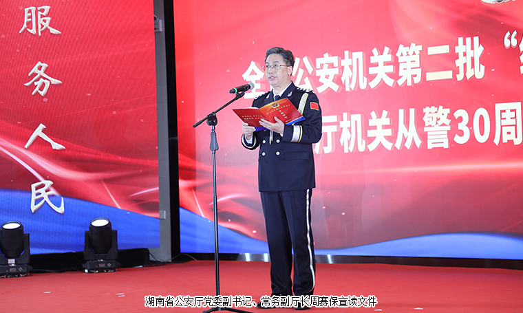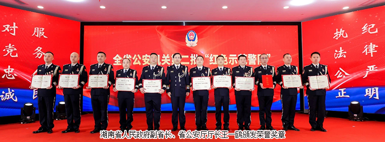 升旗儀式之后,湖南省公安廳舉行第二批“紅色示范警隊”發(fā)布暨從警30年榮譽紀念儀式?,F(xiàn)場觀看了推選宣傳“紅色示范警隊”活動專題片。湖南省公安廳黨委副書記、常務(wù)副廳長周賽保宣讀《關(guān)于第二批“紅色示范警隊”學習宣傳活動的通報》、《授予“湖南公安榮譽章”的決定》。湖南省人民政府副省長、省公安廳廳長王一鷗為第二批“紅色示范警隊”獲評單位、廳機關(guān)從警30周年民警代表頒發(fā)證書、榮譽章?!凹t色示范警隊”在全省公安機關(guān)逐步形成紅色警隊雁陣格局和群體效應(yīng),為全省公安工作高質(zhì)量發(fā)展提供強大精神動力,已成為湖南公安政治建警的一張“紅色名片”。