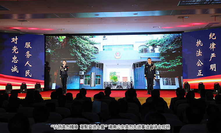 隨后,慶?;顒右浴昂霌P英烈精神 凝聚奮進力量”為主題舉行了湖南公安英烈先進事跡宣講會。宣講會緊扣學習貫徹習近平總書記重要回信精神為主線,分三個篇章,綜合運用現(xiàn)場講述、視頻再現(xiàn)、情景朗誦等形式,全方位展現(xiàn)了近年來全省公安戰(zhàn)線涌現(xiàn)出的具有典型代表性的公安英烈感人事跡,充分表達對公安英烈的深切緬懷,熱情謳歌公安英烈勇于擔當作為、敢于犧牲奉獻的崇高精神。一個個工作瞬間、一點點生活片段,讓現(xiàn)場觀眾真切地走近英雄、感受英雄、了解英雄、學習英雄,激勵全警持續(xù)掀起學習貫徹習近平總書記重要回信精神熱潮,以更加昂揚的姿態(tài)奮進新征程、建功新時代。
