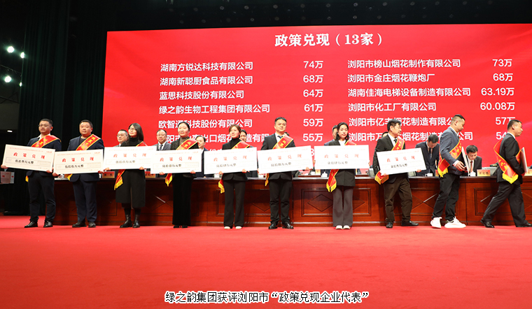 會上,中共瀏陽市委副書記、統(tǒng)戰(zhàn)部部長戴武明宣讀了《關(guān)于對瀏陽市獲得國務(wù)院、國家部委榮譽,受到省人民政府、長沙市人民政府2023年度真抓實干督查激勵單位予以表揚的通報》《關(guān)于表彰瀏陽市“創(chuàng)新實干 擔(dān)當(dāng)有為”先進(jìn)集體和先進(jìn)個人的決定》和《關(guān)于2023年度縣域經(jīng)濟(jì)高質(zhì)量發(fā)展政策兌現(xiàn)的通知》。大會舉行了企業(yè)政策兌現(xiàn)和優(yōu)秀企業(yè)家、民營經(jīng)濟(jì)高質(zhì)量發(fā)展先進(jìn)個人授牌儀式。表揚和表彰獎勵了2023年經(jīng)濟(jì)社會發(fā)展中涌現(xiàn)出的先進(jìn)集體、個人和優(yōu)秀企業(yè)代表。綠之韻生物工程集團(tuán)有限公司獲瀏陽市“政策兌現(xiàn)”表彰、胡國安董事長榮獲瀏陽市“民營經(jīng)濟(jì)高質(zhì)量發(fā)展先進(jìn)個人”、胡均安常務(wù)副總裁榮獲瀏陽市“優(yōu)秀企業(yè)家”。