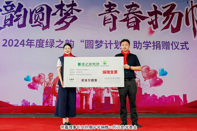 勞嘉理事長表示,捐資助學(xué)是善舉,興學(xué)育人是美德。教育幫扶一直是綠之韻公益基金會的重要關(guān)注點之一。綠之韻成立21年來,在胡國安董事長的倡導(dǎo)下,始終堅持承擔(dān)社會責(zé)任,堅守“讓善行成為生命習(xí)慣 ”的理念,致力于傳遞愛的力量。在綠之韻第五個五年規(guī)劃發(fā)展時期,集團捐贈1000萬設(shè)立“綠韻圓夢”愛心基金。此次捐資20萬用于幫助揚眉中學(xué)少年宮文化建設(shè)和設(shè)立助學(xué)助教獎學(xué)金便是我們“綠韻圓夢”行動重要的實踐之一。未來,我們還希望影響和帶動更多有愛心的人士參與到捐資助學(xué)行動中來,幫助青少年健康成長,為瀏陽教育事業(yè)高質(zhì)量發(fā)展作出積極貢獻。