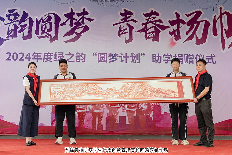 在“綠韻圓夢”捐贈儀式上,勞嘉理事長向揚眉中學(xué)捐贈20萬元助學(xué)基金,萬錦春校長及學(xué)生代表向勞嘉理事長回贈剪紙作品《富春山居圖》,以表達對綠之韻開展助學(xué)公益項目的認可和感謝。