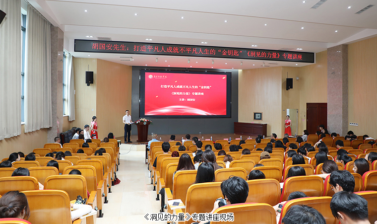 時(shí)值畢業(yè)季,為更好地引導(dǎo)學(xué)生明確人生方向,激發(fā)他們追求夢(mèng)想的勇氣和熱情,6月18日下午,應(yīng)長(zhǎng)沙師范學(xué)院邀請(qǐng),長(zhǎng)沙市人大代表、長(zhǎng)沙師范大學(xué)客座教授、綠之韻集團(tuán)董事長(zhǎng)胡國(guó)安在長(zhǎng)沙師范學(xué)院開(kāi)展“打造平凡人成就不凡人生的金鑰匙——《洞見(jiàn)的力量》專題講座”,為到場(chǎng)的300余名師生帶來(lái)一場(chǎng)振奮人心、精彩紛呈的講座。中共長(zhǎng)沙市委統(tǒng)戰(zhàn)部副部長(zhǎng)、市僑辦主任楊光華,長(zhǎng)沙師范學(xué)院黨委書(shū)記羅婷,長(zhǎng)沙師范學(xué)院校長(zhǎng)曹曉鮮,長(zhǎng)沙師范學(xué)院黨委副書(shū)記周明俠,長(zhǎng)沙師范學(xué)院黨委委員、副校長(zhǎng)黃快林,奧運(yùn)冠軍、體育運(yùn)動(dòng)委員會(huì)專職副主任龔智超等領(lǐng)導(dǎo)參與此次活動(dòng)。