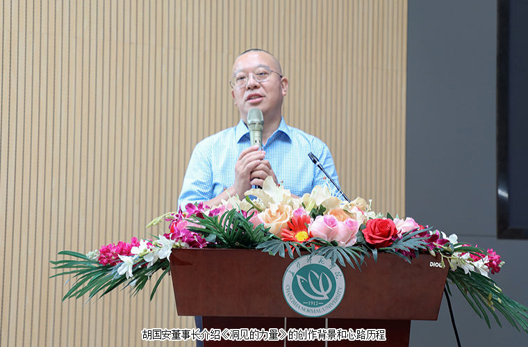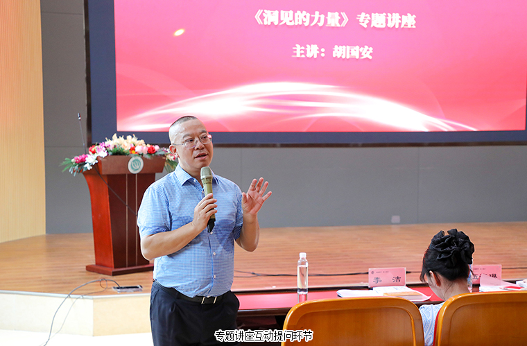 中共長(zhǎng)沙市委統(tǒng)戰(zhàn)部副部長(zhǎng)、市僑辦主任楊光華就專題講座發(fā)表了見(jiàn)解。他認(rèn)為,《洞見(jiàn)的力量》這本新書(shū)的出版,匯聚了胡國(guó)安先生的一種格局和力量,這種格局是胸懷國(guó)家的,釋放出精神的力量、信仰的力量、文化的力量和智慧的力量。是對(duì)“窮者獨(dú)善其身,達(dá)者兼濟(jì)天下”最好的詮釋。胡國(guó)安先生不僅把企業(yè)做大做好,也能夠影響和帶動(dòng)身邊更多的人一起創(chuàng)業(yè),去實(shí)現(xiàn)夢(mèng)想。在他看來(lái),與“看見(jiàn)”二字不同,“洞見(jiàn)”需要的是智慧、思考,是更深的一種綜合體驗(yàn)?zāi)芰?,能看?jiàn)別人看不見(jiàn)的東西?!抖匆?jiàn)的力量》向我們講述了民營(yíng)企業(yè)走向成功的十二大發(fā)展引擎,他認(rèn)為無(wú)論是過(guò)去還是當(dāng)下創(chuàng)業(yè)都是艱難的,都需要有智慧和洞見(jiàn)的能力和才華、需要有堅(jiān)持的力量、更需要常懷感恩之心,與善同行、與愛(ài)同行?!罢嬲拇髳?ài),不是簡(jiǎn)單的給予,而是去搭一座橋,鋪一條路,讓更多的人,抵達(dá)夢(mèng)想的棲息地?!币蝗鐣?shū)中所說(shuō),他勉勵(lì)大家能向胡國(guó)安先生學(xué)習(xí),繼續(xù)傳揚(yáng)和踐行家國(guó)情懷以及大愛(ài)精神,相信這本書(shū)可以點(diǎn)亮大家的創(chuàng)業(yè)夢(mèng)想,希望同學(xué)們?cè)谧龊帽韭毠ぷ鞯耐瑫r(shí),都能有余力去實(shí)現(xiàn)自己的理想,學(xué)以致用,學(xué)有所成。