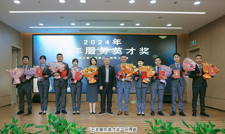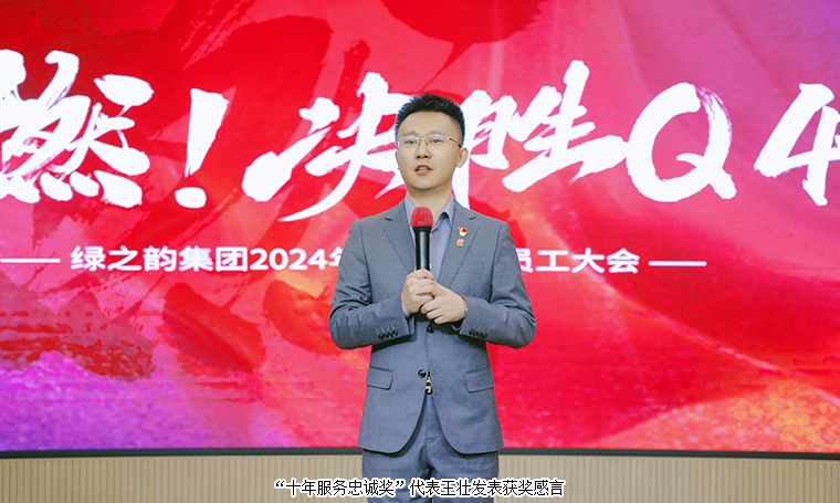 為表彰先進(jìn)、樹(shù)立榜樣、激勵(lì)奮進(jìn),大會(huì)對(duì)2024年度“五年服務(wù)英才獎(jiǎng)”、“十年服務(wù)忠誠(chéng)獎(jiǎng)”、“二十年服務(wù)功勛獎(jiǎng)”進(jìn)行了表彰,鼓勵(lì)全體員工以優(yōu)秀為標(biāo)桿,勇于追求卓越,在工作中實(shí)現(xiàn)個(gè)人價(jià)值與奮斗目標(biāo)。勞嘉總裁、胡均安常務(wù)副總裁依次為獲獎(jiǎng)優(yōu)秀個(gè)人頒發(fā)榮譽(yù)獎(jiǎng)杯和證書(shū)。獲獎(jiǎng)代表王壯、黃茜發(fā)表獲獎(jiǎng)感言,分享了他(她)們加入綠之韻的成長(zhǎng)歷程,并表達(dá)了將始終保持積極進(jìn)取的態(tài)度,珍惜榮譽(yù)、奮勇有為、不斷提升的決心。