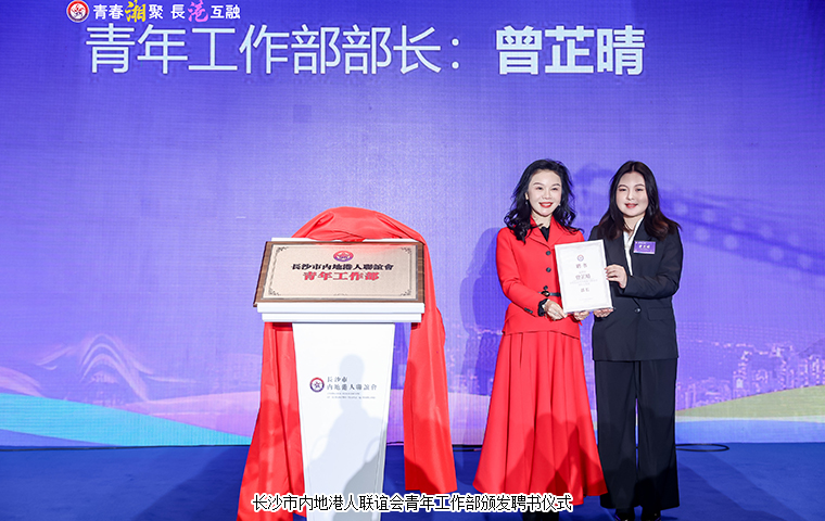 長沙市內地港人聯(lián)誼會會長、湖南高橋大市場股份有限公司總經(jīng)理、華誼兄弟(長沙)電影文化城有限公司董事長羅曉發(fā)表致辭并宣布長沙市內地港人聯(lián)誼會青年工作部正式成立。她表示,青年是國家的未來,是民族的希望,也是聯(lián)誼會不斷發(fā)展壯大的重要力量。成立青年工作部,是順應時代需求、推動聯(lián)誼會事業(yè)持續(xù)發(fā)展的重要舉措。聯(lián)誼會將組織各類青年交流活動,促進兩地青年在思想、文化、科技等方面的碰撞與融合,激發(fā)青年人的創(chuàng)新精神和創(chuàng)業(yè)熱情,推動青年工作部成為長沙與香港兩地青年交流合作的重要力量。她強調,聯(lián)誼會一定不負眾望,以更加飽滿的熱情、更加扎實的工作作風、更加創(chuàng)新的精神,為兩地的繁榮發(fā)展作出新的更大貢獻!隨后,中共湖南省委統(tǒng)戰(zhàn)部港澳臺處處長梁良與羅曉會長共同為青年工作部揭牌,并現(xiàn)場為青年部部長、常務副部長、副部長頒發(fā)聘書。