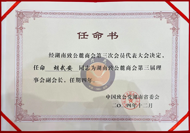 此次當(dāng)選為湖南致公麓商會副會長,胡武安副總經(jīng)理表示:這不僅是一種光榮,更是一份沉甸甸的責(zé)任。未來,他將秉持“致力為公、僑海報國”的宗旨,發(fā)揮自身優(yōu)勢,盡職盡責(zé),將自身及企業(yè)的發(fā)展同國家發(fā)展、經(jīng)濟社會發(fā)展緊密結(jié)合,在致公黨湖南省委會的領(lǐng)導(dǎo)下、在新一屆理事會的帶領(lǐng)下、與各位優(yōu)秀的民營企業(yè)家們一道,發(fā)揮好橋梁紐帶作用,為商會的發(fā)展出謀劃策,為會員企業(yè)提供更好的服務(wù);積極帶領(lǐng)企業(yè)履行社會責(zé)任,進一步凝聚致公力量,立足新起點,實現(xiàn)新發(fā)展,再創(chuàng)新輝煌。