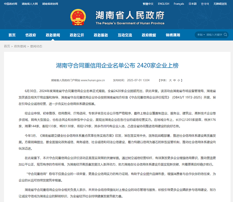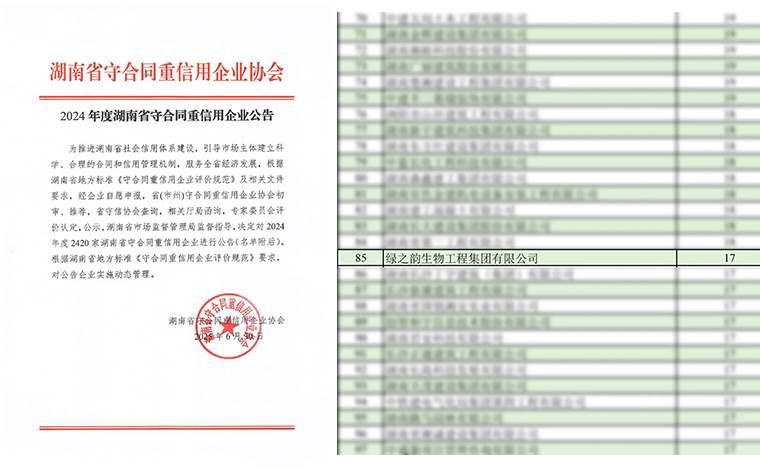 2025年6月,2024年度湖南省守合同重信用企業(yè)名單正式發(fā)布,新湖南、紅網(wǎng)、三湘都市報等相繼進行了公示報道。綠之韻集團憑借深入踐行的誠信理念、完善的合同信用管理體系和卓越的綜合管理水平,連續(xù)第十七年蟬聯(lián)“湖南省守合同重信用企業(yè)”與“長沙市守合同重信用企業(yè)”稱號。這份跨越十七載的持續(xù)認(rèn)可,有力印證了綠之韻將誠信視為企業(yè)生命線、融入發(fā)展血脈的長期堅守。