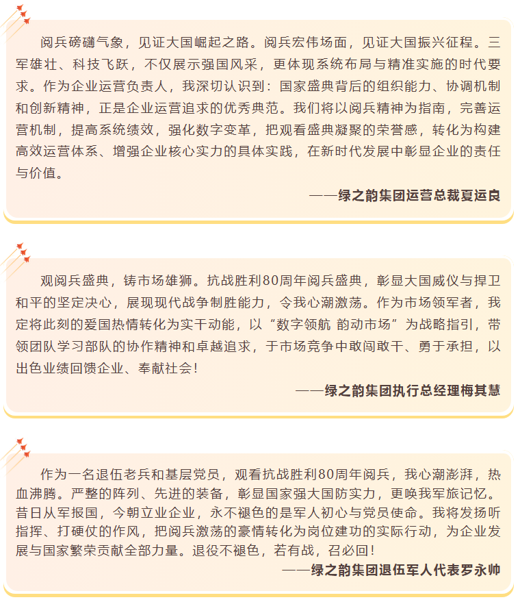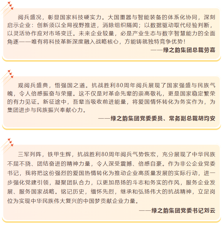 致敬偉大勝利,汲取奮進(jìn)力量。綠之韻集團(tuán)董事長(zhǎng)胡國(guó)安在觀看閱兵儀式后表示,閱兵儀式展現(xiàn)的大國(guó)風(fēng)范和民族精神,正是綠之韻22年來砥礪前行的力量源泉。站在歷史與未來的交匯點(diǎn),我們要更加深刻認(rèn)識(shí)到企業(yè)發(fā)展與國(guó)家命運(yùn)息息相關(guān)。觀看閱兵儀式是一次深刻的愛國(guó)主義教育和精神洗禮,抗戰(zhàn)精神是企業(yè)發(fā)展不可或缺的精神財(cái)富。通過此次觀閱活動(dòng),希望全體綠之韻人要進(jìn)一步汲取歷史智慧、錘煉政治品格,將閱兵儀式所展現(xiàn)的團(tuán)結(jié)奮進(jìn)、自強(qiáng)不息的精神轉(zhuǎn)化為推動(dòng)企業(yè)創(chuàng)新發(fā)展的實(shí)際行動(dòng)。未來,綠之韻集團(tuán)將繼續(xù)深化黨建與企業(yè)發(fā)展同頻共振,引領(lǐng)公司在新時(shí)代征程中踐行社會(huì)責(zé)任、展現(xiàn)企業(yè)擔(dān)當(dāng),為實(shí)現(xiàn)中華民族偉大復(fù)興貢獻(xiàn)力量。