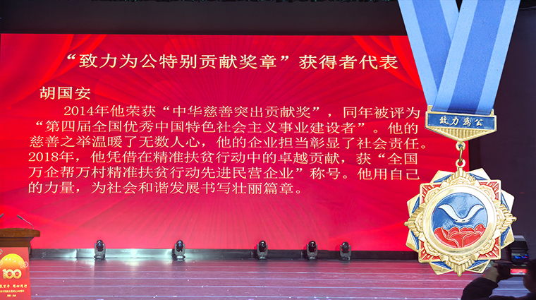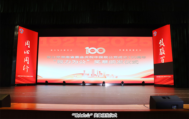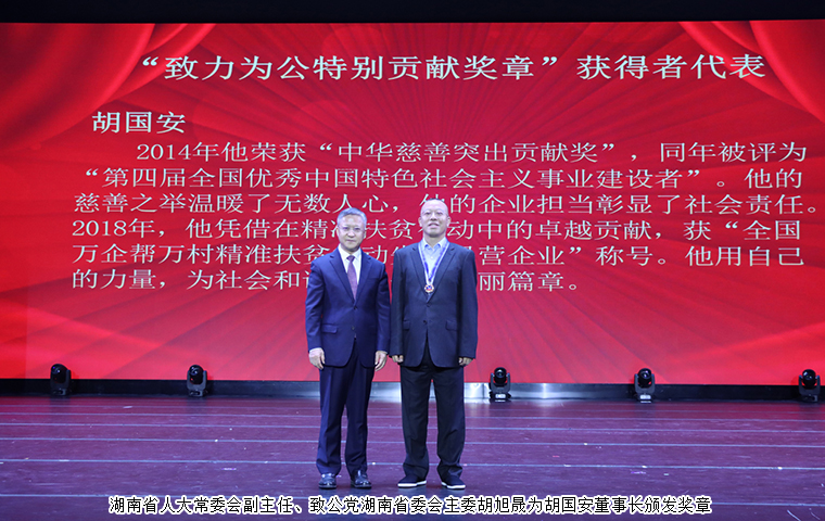 演出前舉行了隆重的“致力為公”獎章頒獎儀式。在熱烈的掌聲中,胡國安董事長上臺接受“致力為公”特別貢獻獎章。頒獎辭寫到:“2014年他榮獲‘中華慈善突出貢獻獎’,同年被評為‘第四屆全國優(yōu)秀中國特色社會主義事業(yè)建設者’。他的慈善之舉溫暖了無數(shù)人心,他的企業(yè)擔當彰顯了社會責任。2018年,他憑借在精準扶貧行動中的卓越貢獻,獲‘全國萬企幫萬村精準扶貧行動先進民營企業(yè)’稱號。他用自己的力量,為社會和諧發(fā)展書寫壯麗篇章。”此項榮譽正是對他多年來在參政議政、社會服務、僑海聯(lián)絡,特別是在公益慈善與鄉(xiāng)村振興等領域持續(xù)貢獻的高度認可,充分體現(xiàn)了致公黨湖南省委會對優(yōu)秀黨員堅守“致力為公、僑海報國”初心的肯定與褒揚。