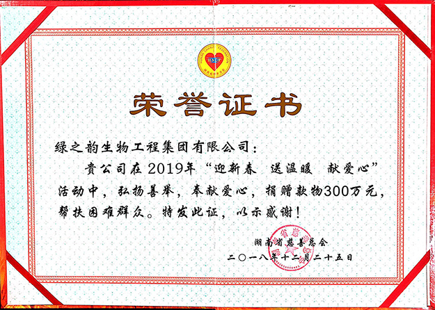 綠之韻集團董事總裁、綠之韻公益基金會理事長勞嘉代表愛心企業(yè)在發(fā)言中說道,非常榮幸能受省民政廳、省慈善總會的邀請,參與2019全省“迎新春送溫暖獻愛心”活動,為幫扶貧困地區(qū)的困難群體獻出一份愛心。綠之韻集團作為湖南省慈善總會的副會長單位,在胡國安董事長的帶領(lǐng)下,一直秉承著“關(guān)愛生命、造福人類”的企業(yè)理念,在發(fā)展實業(yè)的同時,積極承擔社會責任,產(chǎn)業(yè)富民,回饋社會。十五年愛心之旅,綠之韻陸續(xù)在全國捐建了11所希望小學(xué),打造了“關(guān)愛貧困母親”“關(guān)愛百歲老人”“樹人行動”“綠韻圓夢·書香助學(xué)”等12大公益品牌、100多項公益項目。同時,通過“線上+線下愛心集結(jié)”“健康+公益”等現(xiàn)代公益創(chuàng)新模式,更大力度、廣度、深度地參與到教育、醫(yī)療、賑災(zāi)、扶貧、幫困等公益事業(yè)。截至2018年底,綠之韻開展了400多場愛心活動,匯聚了6萬多名愛心志愿者,捐助款物6700多萬元,足跡遍布全國20多個省市和地區(qū),用實際行動履行著企業(yè)應(yīng)盡的責任和義務(wù)。此次,綠之韻集團向湖南慈善總會捐贈愛心款物300萬元用于對貧困地區(qū)困難群眾的幫扶慰問,希望能匯點滴之愛,聚江海之力,號召更多的社會愛心人士共同參與到“迎新春送溫暖獻愛心”的活動中,為全省打贏脫貧攻堅戰(zhàn)、為建設(shè)富饒美麗幸福新湖南貢獻出自己的力量!