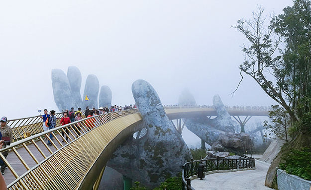 來到巴拿山,便仿佛來到了書里的童話世界。綠之韻家人們乘坐著世界吉尼斯單線最長、落差最大的懸索纜車上山后,首先便來到了火熱一時(shí)的網(wǎng)紅景點(diǎn)——佛手橋打卡。從外觀來看,佛手橋看起來就像是兩只巨大的手掌將一座金橋像浮塵一樣托在手掌中。從橋的一端向另一端看,橋上的家人們仿佛是在煙霧繚繞的云層中行走。在位于海拔1400米的巴拿山頂,還有一座法國小鎮(zhèn)。小鎮(zhèn)上有著東南亞最大的機(jī)動(dòng)游樂場(chǎng),堪稱越南“迪士尼”,家人們仿佛回到童年的孩子一樣,愉快的在城堡中玩耍著各種娛樂設(shè)施,重溫著童年的樂趣。