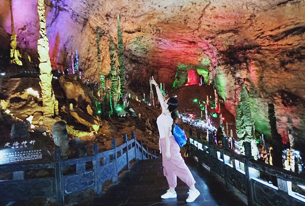“世界溶洞奇觀”黃龍洞規(guī)模之大、內(nèi)容之全、景色之美,包含了溶洞學(xué)的所有內(nèi)容。綠之韻家人感受龐大的立體結(jié)構(gòu)洞穴空間、豐富的溶洞景觀、水陸兼?zhèn)涞挠斡[觀光線路,洞內(nèi)鐘乳石種類繁多,潔白晶瑩的鐘乳石、石筍、石柱、石幔、石花、卷曲石、石珍珠、石珊瑚等玲瓏剔透,游覽天仙水瀑布、花果山、龍宮大廳、定海神針,每一根石筍都令綠之韻家人驚嘆稱奇。