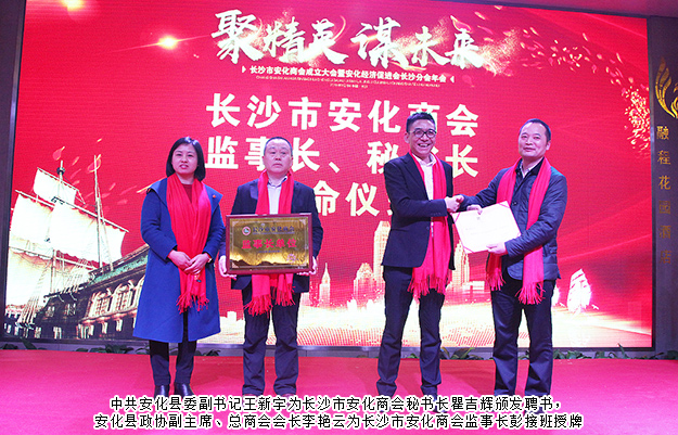 聚精英,謀未來。2018年2月4日,長沙市安化商會成立大會暨安化經(jīng)濟促進會長沙分會年會在長沙舉行。湖南省政協(xié)常委、長沙市政協(xié)副主席、長沙市工商聯(lián)主席彭繼球,中共益陽市委常委、統(tǒng)戰(zhàn)部部長周振宇,安化縣人民政府縣長肖義,長沙市民政局黨委副書記、副局長伍仁華,中共安化縣委副書記王新宇,益陽市人民政府駐長沙辦事處主任聶超美,長沙市工商聯(lián)副主席張明剛,安化縣政協(xié)副主席、總商會會長李艷云,長沙市社會組織管理局局長李紅輝等領(lǐng)導(dǎo)嘉賓出席會議。湖南省政協(xié)委員、湖南省工商聯(lián)(總商會)副會長、長沙市安化商會會長、綠之韻集團董事長胡國安,綠之韻集團董事、總裁勞嘉,綠之韻集團常務(wù)副總經(jīng)理胡均安,綠之韻集團副總經(jīng)理夏運良受邀參加活動。大會還邀請了來自深圳、廈門、株洲、益陽等兄弟安化商會及長沙各行業(yè)安化籍知名企業(yè)和精英人士 400 多人匯智聚力一堂,共謀發(fā)展大計。
