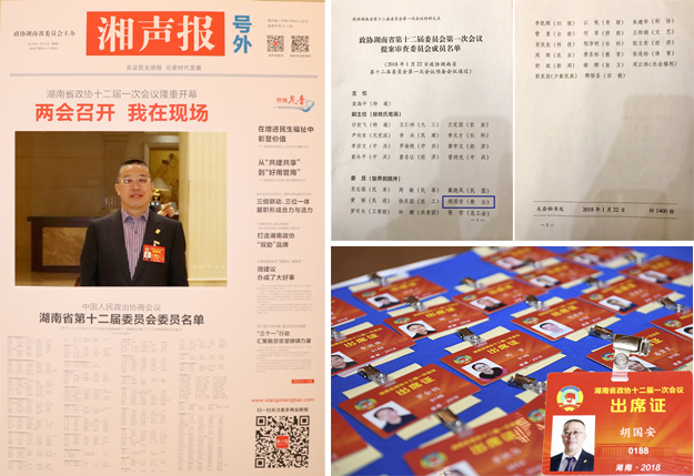 “他剛從苦難中走出來,轉身就把手伸向了后面的人。在他看來,財富僅僅是一個有增有減的數字,責任才是生命中最重要的擔當?!边@是2016年胡國安委員榮獲“CCTV感動中國之感動湖南人物”的頒獎詞,也是他甘于奉獻、建言履職的最生動注腳。作為一名三屆“老委員”,胡國安任職第十、第十一屆政協委員期間,深入廣泛調研,積極建言獻策,曾先后提交了《關于推進“互聯網+扶貧”模式,實施精準扶貧的建議》《關于加速推進慈善事業(yè)立法的相關建議》《關于加快我省推進電子商務進農村的幾點合理化建議》《關于加速推進湖南省電商網商發(fā)展的幾點建議》《關于加強互聯網管理、遏制網絡謠言的合理化建議》等20多件提案,涉及精準扶貧、關愛青少年、電子商務、互聯網+、公益事業(yè)、綠色健康、低碳環(huán)保等多個社會層面,得到了省委省政府及相關部門、媒體的重視和贊譽。其中,胡國安委員在政協湖南省第十屆委員會第四次會議上代表無黨派人士的發(fā)言《積極引導非公有制經濟融入“四化兩型”戰(zhàn)略的建議》受到最高人民法院院長(時任中共湖南省委書記)周強的重要批示,并被評為“優(yōu)秀政協委員”;在政協湖南省第十一屆委員會第五次會議上,所提交的提案《關于推進“互聯網+扶貧”模式,實施精準扶貧的建議》被省政協表彰為“優(yōu)秀提案”。
